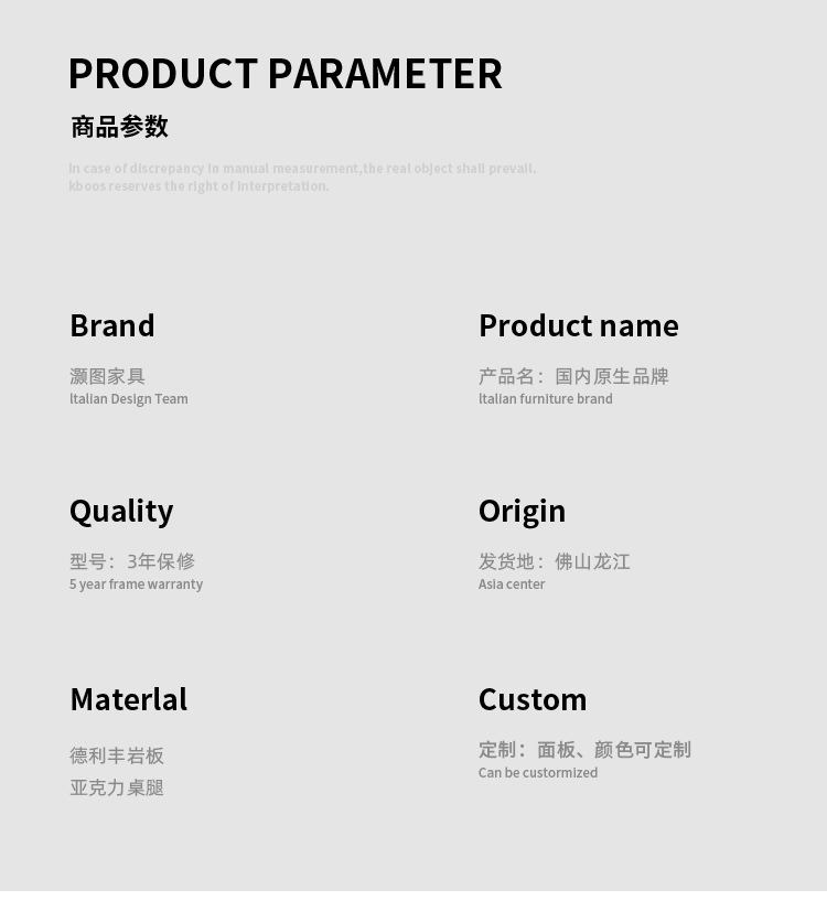 Phong cách sang trọng nhẹ nhàng: Màu retro kiểu Pháp: không treo – Đá phiến Inno [trắng tinh khiết] / không treo – Đá phiến Delifeng [Đen Aurora] / Máy tính để bàn dày treo 5cm – Đá phiến Delifeng [Đen Aurora] 】/Không treo từ dưới lên – Delifeng đá phiến [Aurora White] / Mặt bàn dày treo 5cm – Đá phiến Delifeng [Aurora White] / 4 ghế ăn kiểu A [da chống mài mòn] / 4 ghế ăn kiểu B hoặc kiểu C [chọn một trong hai kiểu]/4 ghế ăn kiểu D hoặc E [chọn một trong hai kiểu]/4 chiếc ghế ăn kiểu F hoặc G [chọn một trong hai kiểu]/4 chiếc ghế ăn kiểu F hoặc G [Chọn một trong hai kiểu] Gấp : Không Model: CZ-362# Phương pháp xử lý: Tùy chỉnh theo mẫu Có được cấp bằng sáng chế không: Không Giao đến tận nhà: Giao lên tầng trên Có cung cấp dịch vụ lắp đặt: Có Vật liệu hoàn thiện: PVC Có thể thu vào : Không Màu đen: Căn hộ nhỏ có máy bơm hay không: Không Chất liệu: Acrylic Đối tượng áp dụng: Người lớn Cung cấp độc quyền cho xuất khẩu xuyên biên giới: Có Hình dạng: Hình chữ nhật Cấu trúc nội thất: Mã mặt hàng kết hợp: CZ-362# Thương hiệu: Michelin Số người áp dụng: 4 người -vật liệu mặt bàn dành cho 8 người : tấm đá Thông số kỹ thuật: 1,4 mét/1,6 mét/1,8 mét Cho dù có mô hình 3D hay không: Không Liệu máy tính để bàn có thể điều chỉnh được hay không: Không Các nền tảng hạ nguồn chính: ebay/Amazon/wish/AliExpress/Independent Station/LAZADA/LAZADA Có được ủy quyền không thương hiệu riêng: Có phải là người nộp thuế thông thường?Có phải là giá treo trong suốt phía dưới: chức năng hiện đại và đơn giản: tháo rời/tháo rời/tháo rời Kích thước: bàn ăn 120*60*75cm/bàn ăn 130*70*75cm/bàn ăn 140*70* 75cm/bàn ăn 160*80*75cm/bàn ăn 180*80*75cm/bàn ăn 180*80*75cm Không gian: Nhà hàng có bếp từ Chức năng: Không Phong cách: Ý tối giản Khu vực bán hàng chính: Châu Âu/Nam Mỹ/ Đông Nam Á/Bắc Mỹ/Đông Bắc Á/Trung Đông/Khác/Khác Dù có bàn xoay hay không: Không Yếu tố thiết kế: Kim loại