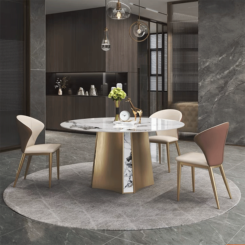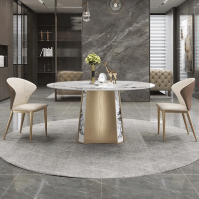 Bàn ăn đá phiến sáng nhà gia đình ánh sáng sang trọng tối giản bàn ăn tròn cao cấp kết hợp bàn ghế ăn với bàn xoay là sản phẩm nổi bật trong dòng bàn ăn nhập khẩu, thiết kế hiện đại và sang trọng, phù hợp với nhiều không gian nội thất cao cấp.