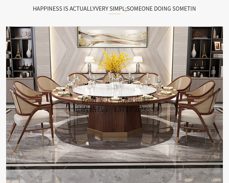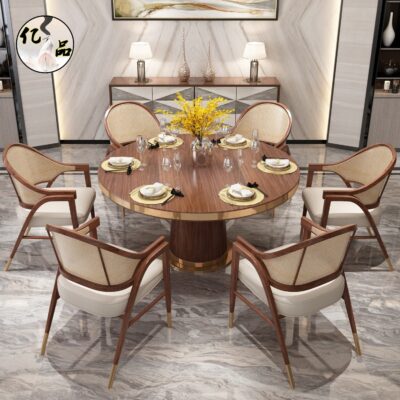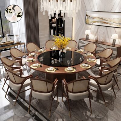 Bàn ăn gỗ chắc chắn phong cách Trung Quốc mới và ghế khách sạn điện bàn tròn lớn 20 người sang trọng đơn giản câu lạc bộ bàn lẩu bán buôn là sản phẩm nổi bật trong dòng bàn ăn nhập khẩu, thiết kế hiện đại và sang trọng, phù hợp với nhiều không gian nội thất cao cấp.