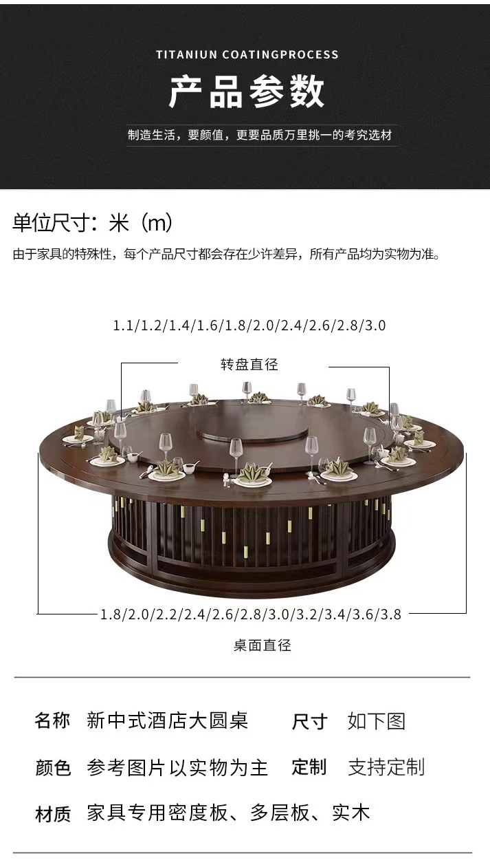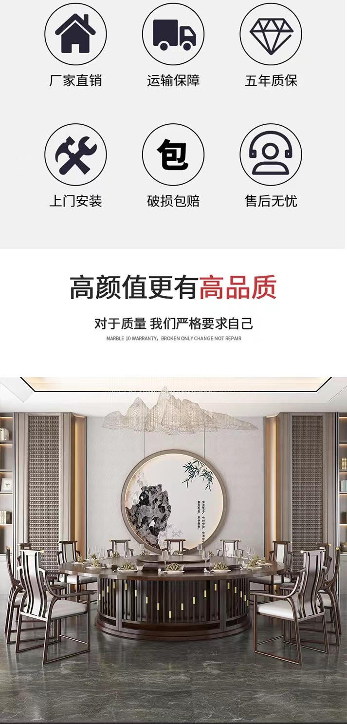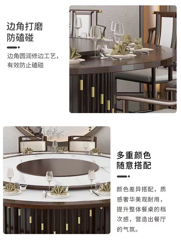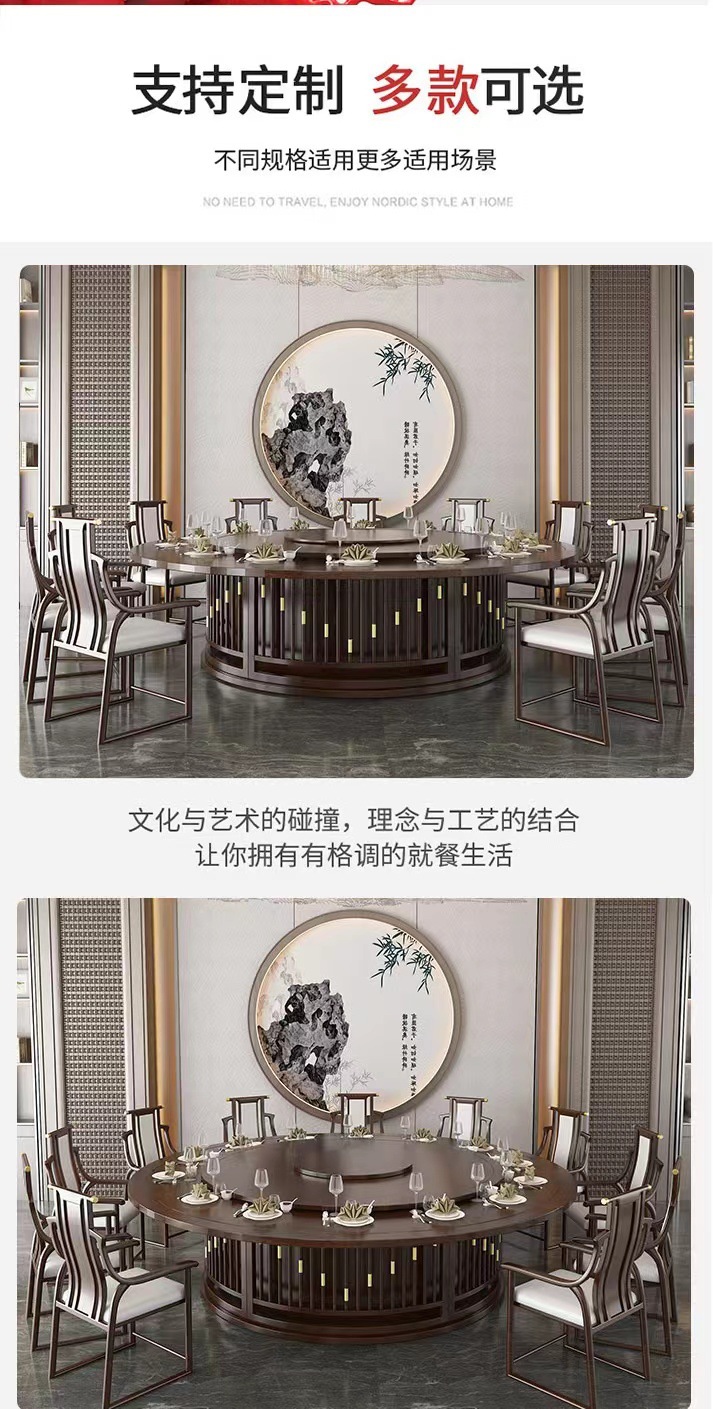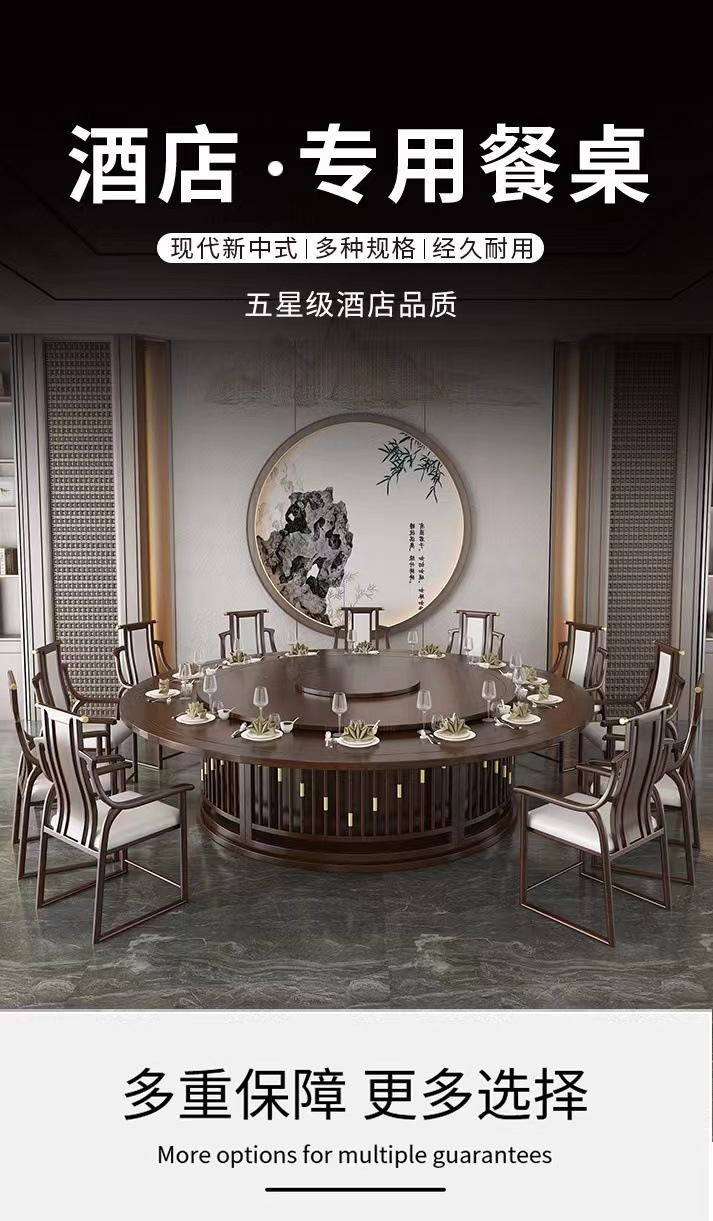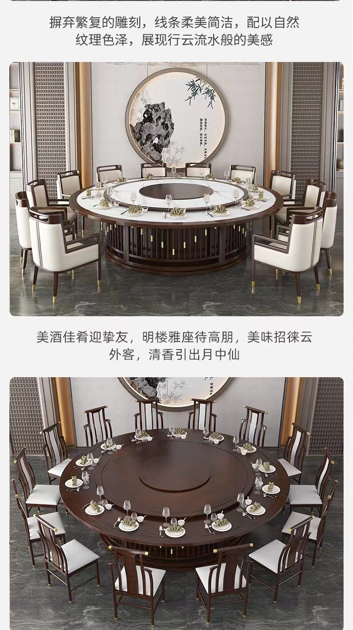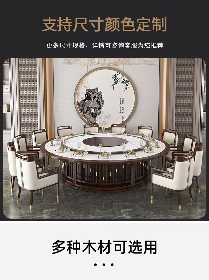 Bàn ăn khách sạn phong cách Trung Quốc mới bàn tròn lớn 10 người 15 người 20 người câu lạc bộ gỗ rắn bàn lẩu quay điện là sản phẩm nổi bật trong dòng bàn ăn nhập khẩu, thiết kế hiện đại và sang trọng, phù hợp với nhiều không gian nội thất cao cấp.