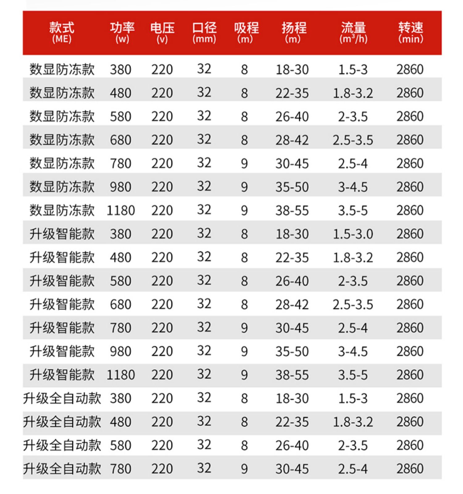 Thương hiệu: Khác Chất liệu thân bơm: gang Thông số kỹ thuật: Nâng cấp hoàn toàn tự động 380W + tự động khởi động và dừng + cảm biến áp suất / nâng cấp hoàn toàn tự động 480W + khởi động và dừng tự động + cảm biến áp suất / nâng cấp hoàn toàn tự động 580W + tự động khởi động và dừng + cảm biến áp suất / nâng cấp hoàn toàn tự động 780W + khởi động và dừng tự động +Cảm biến áp suất/__________ ________________/____________________________________/model thông minh nâng cấp 580W+cấp nước hẹn giờ+bảng điều khiển thông minh/model thông minh nâng cấp 680W+cấp nước hẹn giờ+bảng điều khiển thông minh/cấp nước thông minh nâng cấp 780W+cấp nước hẹn giờ cung cấp+bảng điều khiển thông minh/model thông minh nâng cấp 980W+thời gian Sheung Shui + Bảng điều khiển thông minh/________________________________/Chất chống đông kỹ thuật số 380W+Màn hình áp suất+Tự động khởi động/Dừng/Chất chống đông kỹ thuật số 480W+Màn hình áp suất+Khởi động/Dừng/Chất chống đông kỹ thuật số tự động 580W+Áp suất Màn hình + Tự động khởi động/Dừng/Chất chống đông kỹ thuật số 680W + màn hình áp suất + khởi động và dừng tự động / màn hình kỹ thuật số model chất chống đông 780W + màn hình áp suất + khởi động và dừng tự động / màn hình kỹ thuật số chất chống đông model 980W + màn hình áp suất + khởi động và dừng tự động / màn hình kỹ thuật số chất chống đông model 1180W + hiển thị áp suất + khởi động và dừng tự động /_________________ ____________/bơm trần 390W hoàn toàn tự động mới/bơm trần 580W hoàn toàn tự động được nâng cấp/máy bơm trần 580W kỹ thuật số/chất chống đông kỹ thuật số model 380W-bơm trần/mới hoàn toàn tự động 320W+tự động khởi động-dừng+cảm biến áp suất /mới hoàn toàn tự động 390W+khởi động tự động-dừng+cảm biến áp suất/mới hoàn toàn tự động 490W+khởi động tự động Dừng + cảm biến áp suất/mới hoàn toàn tự động 490W + khởi động và dừng tự động + cảm biến áp suất Chế độ lái: Điện Lưu lượng tối đa: 10 Độ nâng tối đa : 10