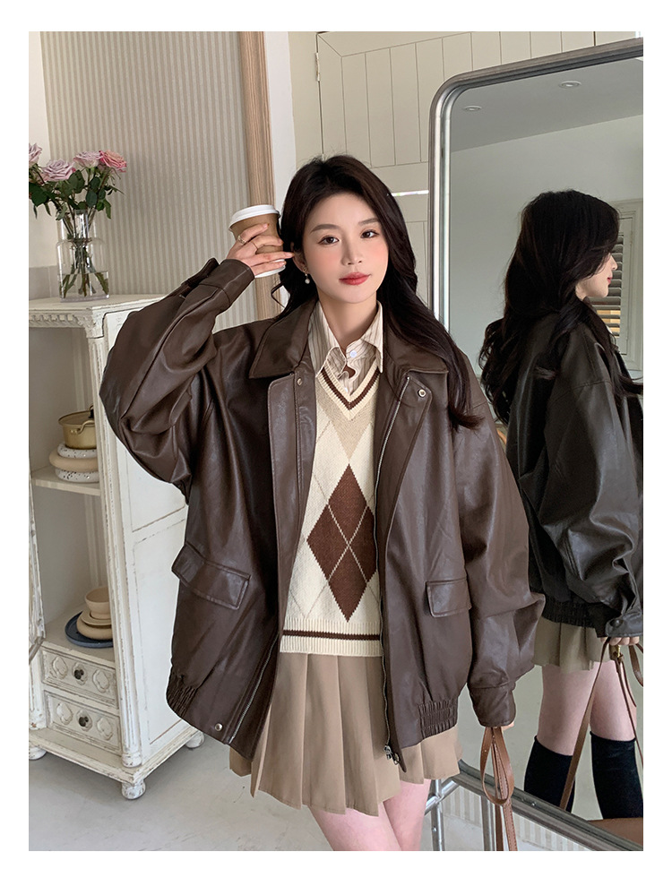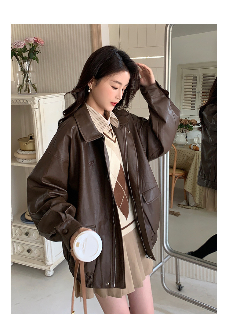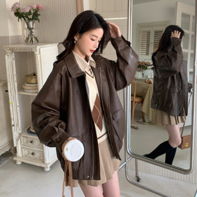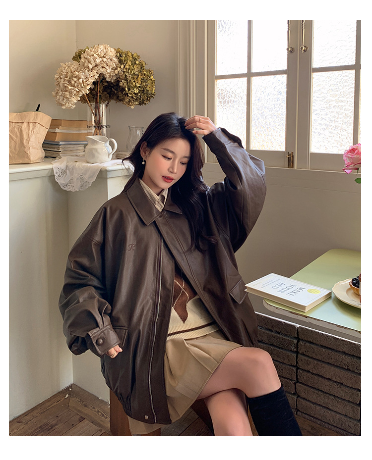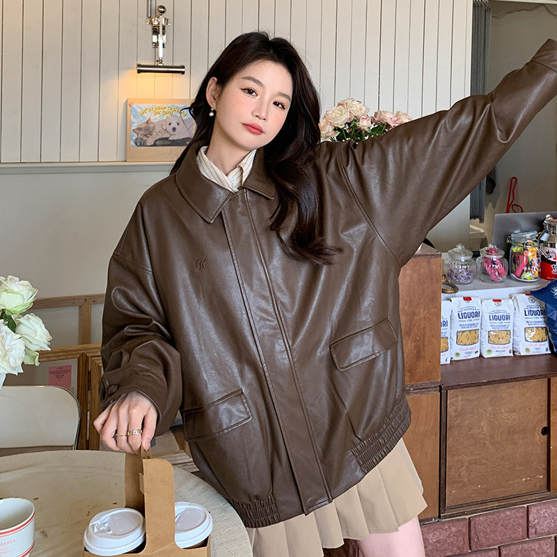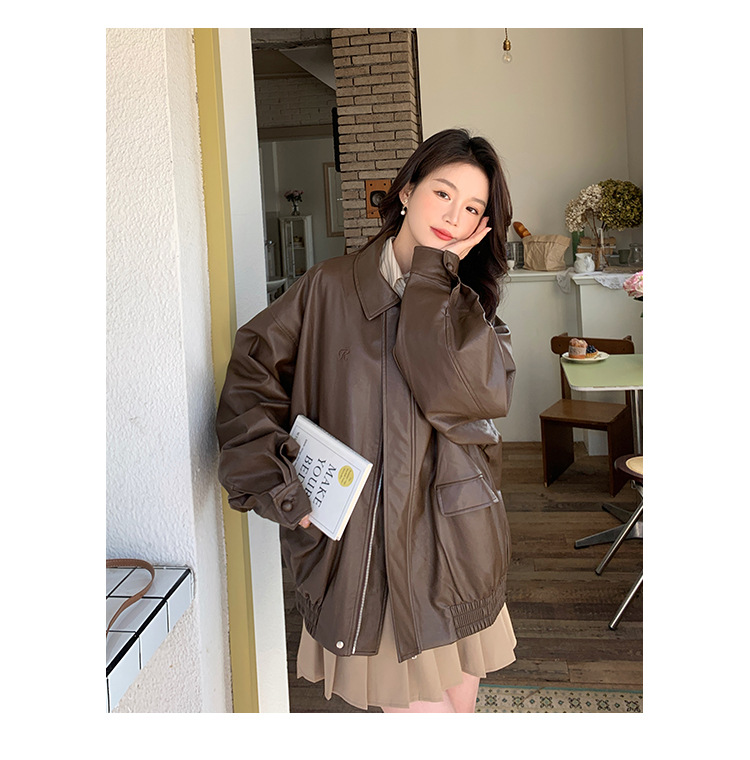 Bán buôn phong cách Hồng Kông ánh sáng retro thời trang hình bóng mỏng thêu chữ hạt dẻ nhỏ màu cà phê áo khoác da áo khoác nữ