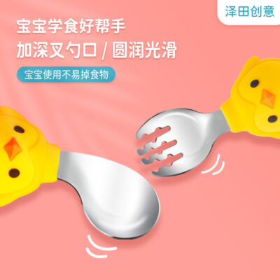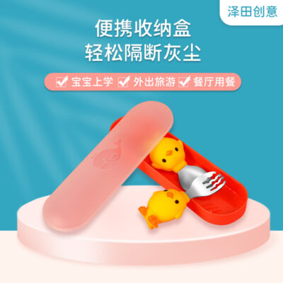 便携儿童餐具套装 卡通硅胶勺子不锈钢宝宝学吃饭训练