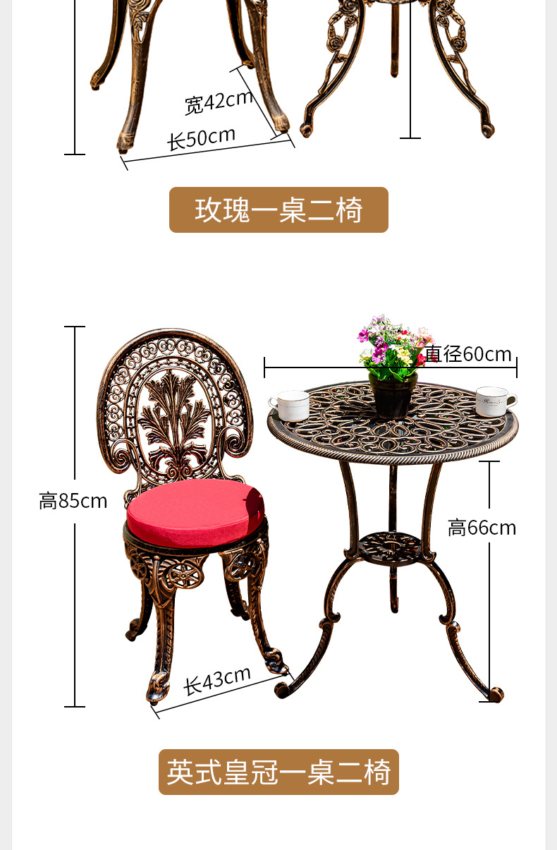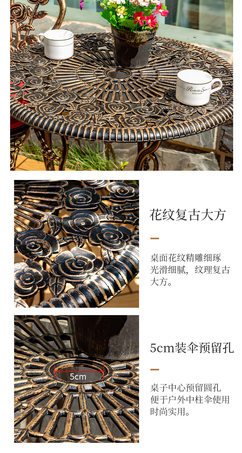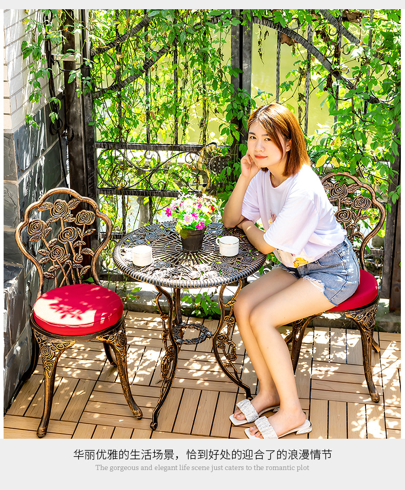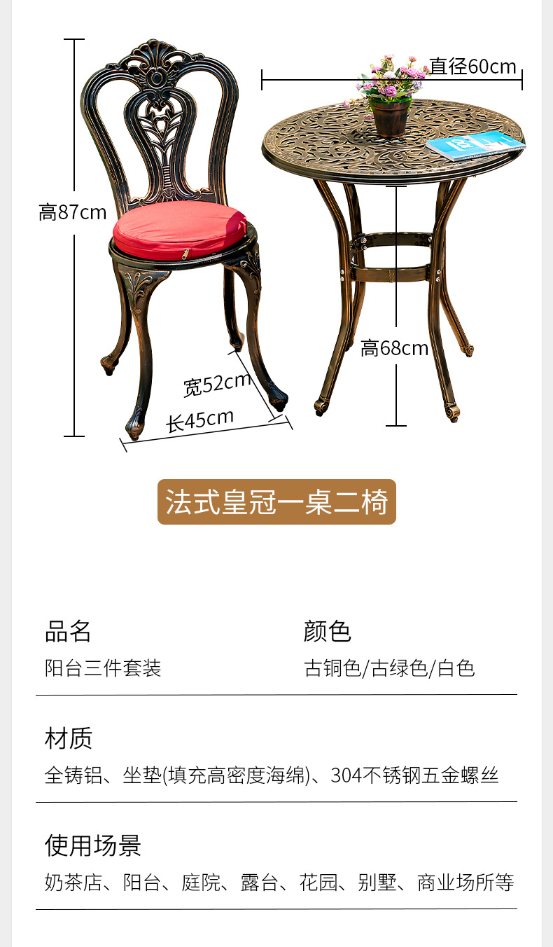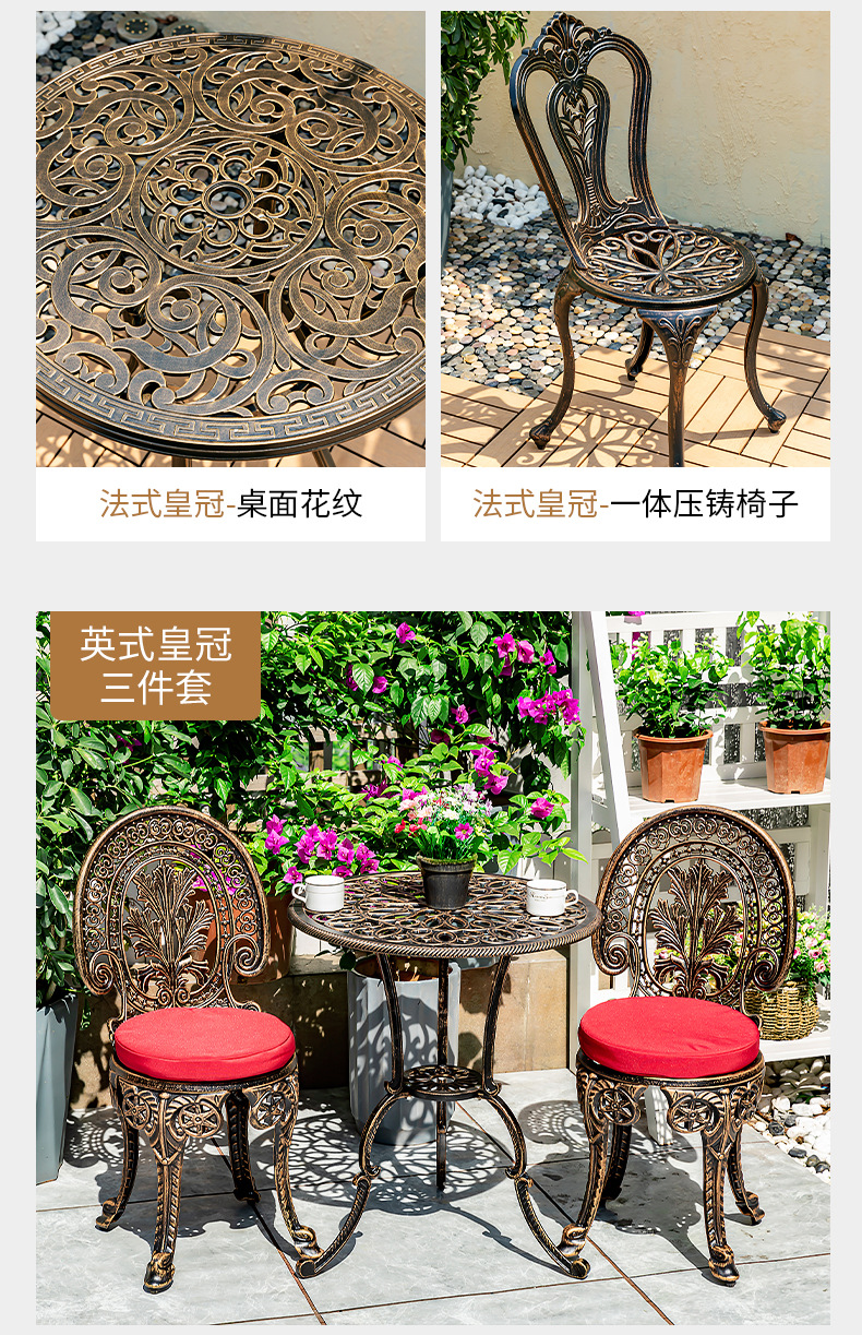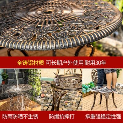 Ban công bàn ghế nhỏ ngoài trời sân vườn phong cách Châu Âu nhôm đúc chống mưa ngoài trời bằng sắt rèn sân thượng giải trí bàn cà phê bộ ba món được thiết kế để tạo điểm nhấn cho khu vực sân vườn, ban công hoặc không gian ngoài trời.