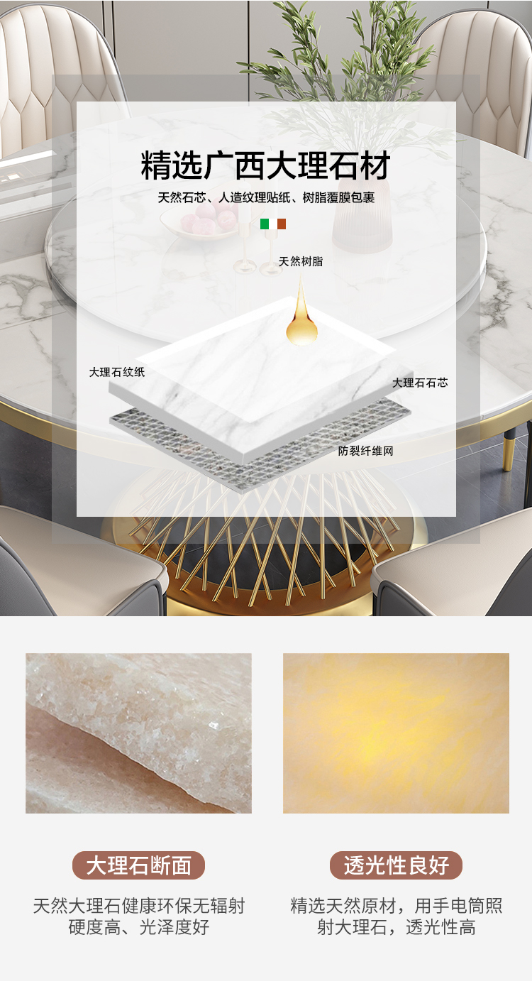 Bàn ghế ăn bằng đá cẩm thạch sang trọng nhẹ kết hợp bàn ăn tròn gia đình tối giản hiện đại với bàn xoay đá xoay bàn và ghế tròn