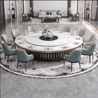 Bàn ghế ăn đá phiến khách sạn biệt thự Bàn tròn lớn có bàn xoay điện Bếp điện từ 20 người Bàn ăn gia đình lẩu là sản phẩm nổi bật trong dòng bàn ăn nhập khẩu, thiết kế hiện đại và sang trọng, phù hợp với nhiều không gian nội thất cao cấp.