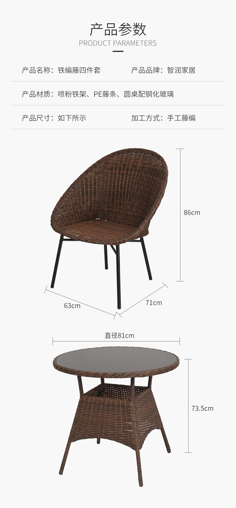 Bàn ghế Bàn ghế mây kết hợp sân vườn Châu Âu nội thất giải trí khách sạn ban công ngoài trời đồ ăn phương tây bàn ghế mây Mã sản phẩm: ZRF-B2 Thương hiệu: Zhirun Home Furnishing Màu sắc: Bộ tứ sản phẩm mây tre Mẫu mã: ZRF-B2 Phương pháp gia công: LOGO OEM Thông số kỹ thuật: Bàn: Đường kính 81cm, Chiều cao 73,5cm Có cung cấp dịch vụ lắp đặt hay không: Không Có giao hàng hay không đến cửa của bạn: Không Các nền tảng hạ lưu chính để giao hàng tận nơi: ebay/Amazon/wish/AliExpress/Independent Station/LAZADA/Others/Others Thương hiệu riêng được ủy quyền: Có Cho dù đó là người nộp thuế chung: Có Cấu hình: sắt phun bột khung + Bàn tròn mây PE Có kính cường lực Chất liệu: Mây PE Kích thước: Cho dù sự kết hợp là xuất khẩu xuyên biên giới Nguồn cung cấp đặc biệt: Có Khu vực bán hàng chính: Châu Phi/Châu Âu/Nam Mỹ/Đông Nam Á/Bắc Mỹ/Đông Bắc Á/Trung Đông /Others/Others Phong cách: Hiện đại và đơn giản