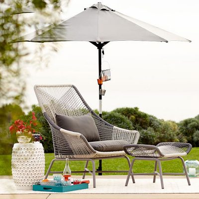 Bàn ghế mây. Bộ 1 bàn 2 ghế làm bằng nan mây lưới. Đặt ngoài ban công để thư giản.