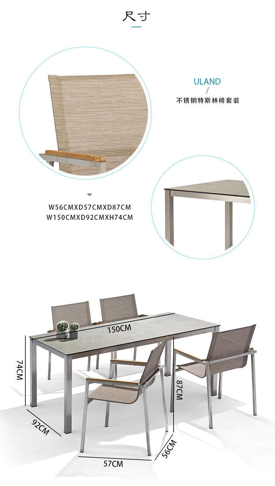 Bàn ghế ngoài trời kết hợp bàn ghế sân vườn lưới thép không gỉ Teslin ngoài trời sân vườn ban công bàn ghế giải trí 户外桌椅组合 ¥650 ¥700 ¥1800 ¥1000 户外家具餐桌椅 休闲庭院露天外摆铝合金HPL圆桌花园阳台户外桌椅 简约阳台家具外摆桌椅 休闲别墅露天餐桌椅组合铝合金户外桌椅 露天阳台户外桌椅 庭院休闲全铝拉伸餐桌椅组合户外防晒防锈桌椅 简约休闲家具外摆桌椅 户外花园庭院铝合金拉伸露天餐桌椅组合 ¥340 ¥364 ¥556 ¥289 户外家具庭院桌椅组合 不锈钢特斯林网布室外花园阳台休闲桌椅 厂家直供简约户外桌椅 露台庭院柚木餐桌绳编金属椅子阳台小桌椅 厂家直供户外餐椅组合 休闲简约室外露天防腐防晒不锈钢庭院桌椅 简约庭院花园露台家具 室外休闲餐厅炭灰色不锈钢户外餐桌椅组合 品类 休闲、户外家具 品名 不锈钢特斯林椅套装 类别 户外金属桌椅组合系列 现货 有现货,量大请咨询客服 材质 不锈钢管、特斯林布、柚木、 进口HPL高温层压板等 风格 现代简约 尺寸 椅子: W56CM*D57M*H87CM、 W56CM*D59M*H85CM 台子:W158CM*D92CM*H74CM(方)、 W110CM*H75CM(圆 ) 包装 椅子(4件/箱): 86 CM *58 CM *98 CM 、 58 CM *83 CM *101 CM 台子(1件/箱):114 CM *114 CM *12 CM(方) 163 CM *96 CM *13 CM(圆) 产品细节 台湾特斯林布; 椅子不锈钢管框架; 扶手设计,触感; 进口HPL高温层压板台面; 使用场所 庭院、花园、露台等室内外场所 运费说明: 系统生产运费会有误差,请联系客服重新核算一下运费,谢谢! 注意事项: 产品颜色受屏幕显示器和环境光影响,稍有色差,属于正常情况。 尺寸手工测量 ,稍有误差,属于正常情况。 ? ? 桌椅套装系列 HOT RECOMMENDATION 狂欢价 ¥214 狂欢价 ¥245 狂欢价 ¥340 狂欢价 ¥350 狂欢价 ¥364 狂欢价 ¥556 狂欢价 ¥238 狂欢价 ¥323 ? ? Mã sản phẩm: U2318-U3336-15090-HPL Thương hiệu: Ulan Màu sắc: Inox Ghế Teslin (4 Cái)/11684280-Ghế bập bênh Teslin Inox (4 Cái)/Bàn Inox Mặt Bàn HPL/Bàn Tròn Inox/Bàn Inox Bàn tròn Loại sản phẩm: Bàn ghế kim loại ngoài trời Kiểu mẫu: Bộ bàn ghế inox Phương pháp gia công: Tùy chỉnh theo bản vẽ / Trạm độc lập / Trạm độc lập có thương hiệu riêng có thể được ủy quyền: Có Cho dù đó là người nộp thuế chung: Có Chức năng : Chống thấm nước và chống nắng Chất liệu: Thép không gỉ Không g