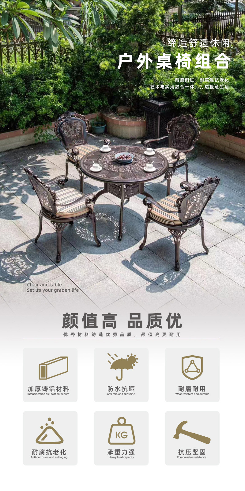 Bàn ghế ngoài trời nhôm đúc bàn dài sân vườn ngoài trời ban công ghế ăn thường kết hợp bàn ghế ngoài trời chống mưa Châu Âu được thiết kế để tạo điểm nhấn cho khu vực sân vườn, ban công hoặc không gian ngoài trời.