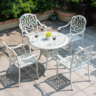 Bàn ghế ngoài trời sân biệt thự bàn ghế nhôm đúc bàn ghế ngoài trời sân vườn ban công bàn ghế sắt rèn chống gỉ được thiết kế để tạo điểm nhấn cho khu vực sân vườn, ban công hoặc không gian ngoài trời.