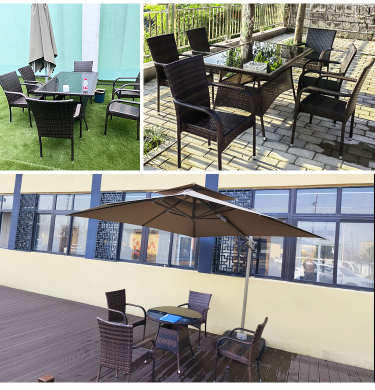[Bàn ô kết hợp] 6 ghế tựa tròn 150x90cm vuông góc toàn mây bàn dài 3m dù La Mã
