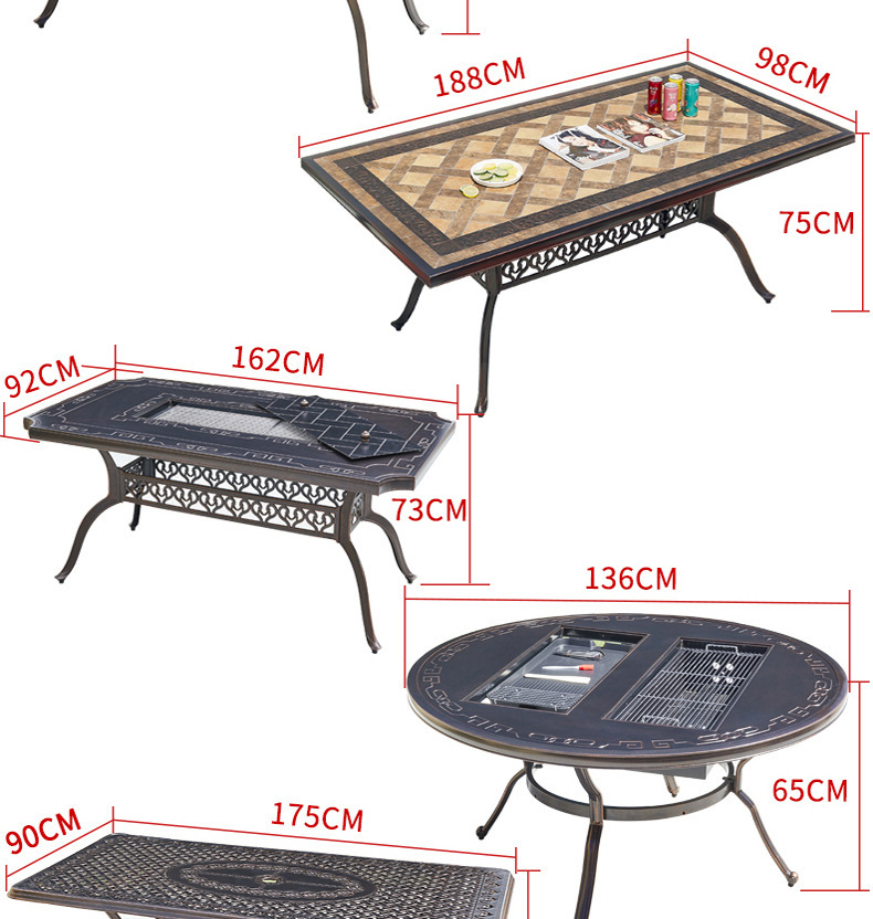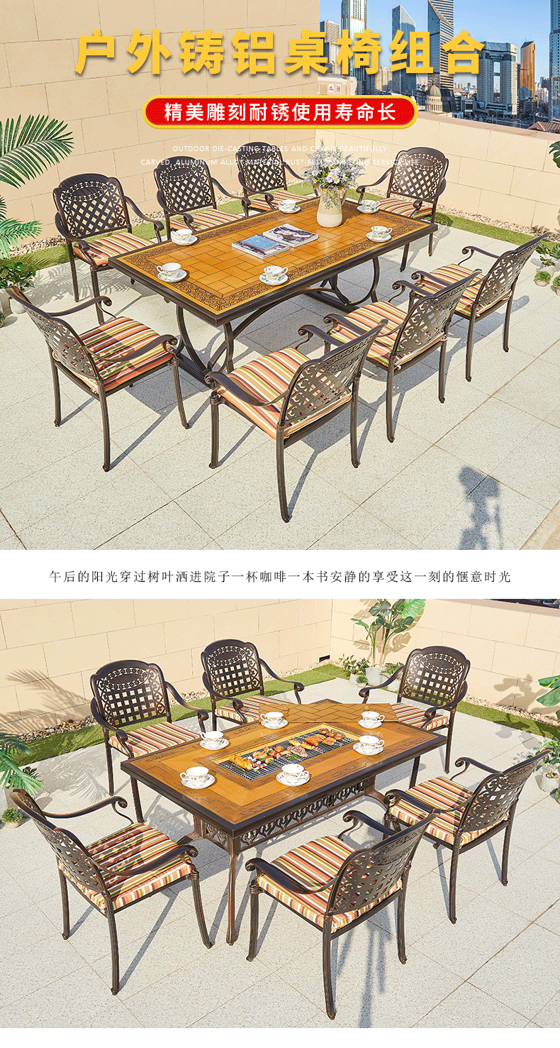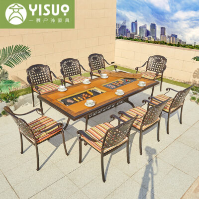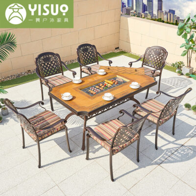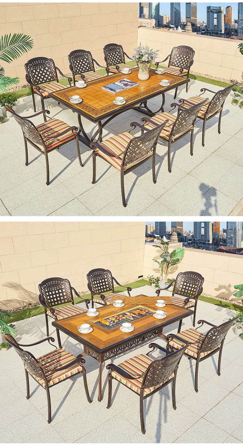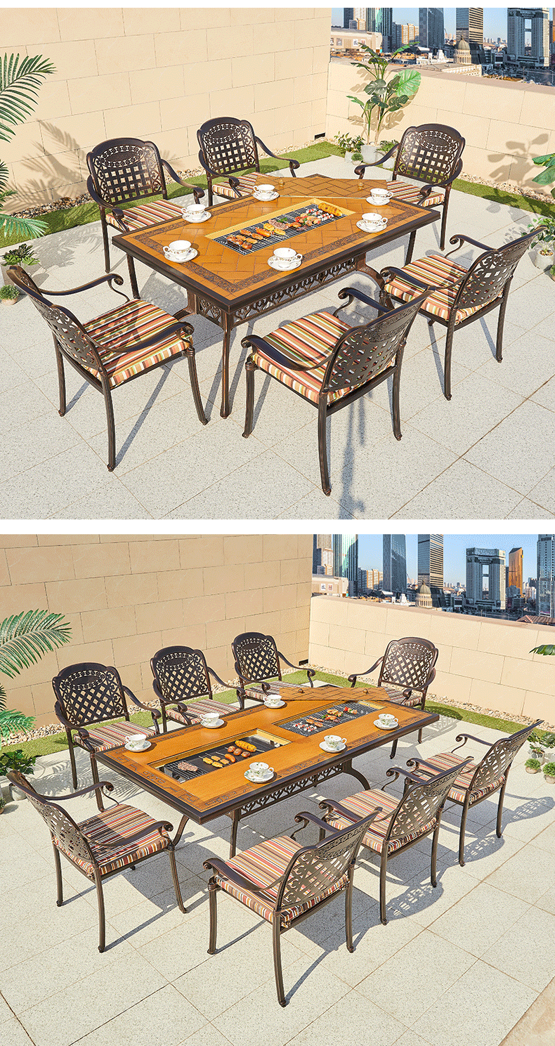 Bàn ghế ngoài trời sân vườn bếp nướng than hoa bếp nướng điện kết hợp bàn ghế ăn ngoài trời chống mưa nắng bàn ghế ăn nhôm đúc được thiết kế để tạo điểm nhấn cho khu vực sân vườn, ban công hoặc không gian ngoài trời.