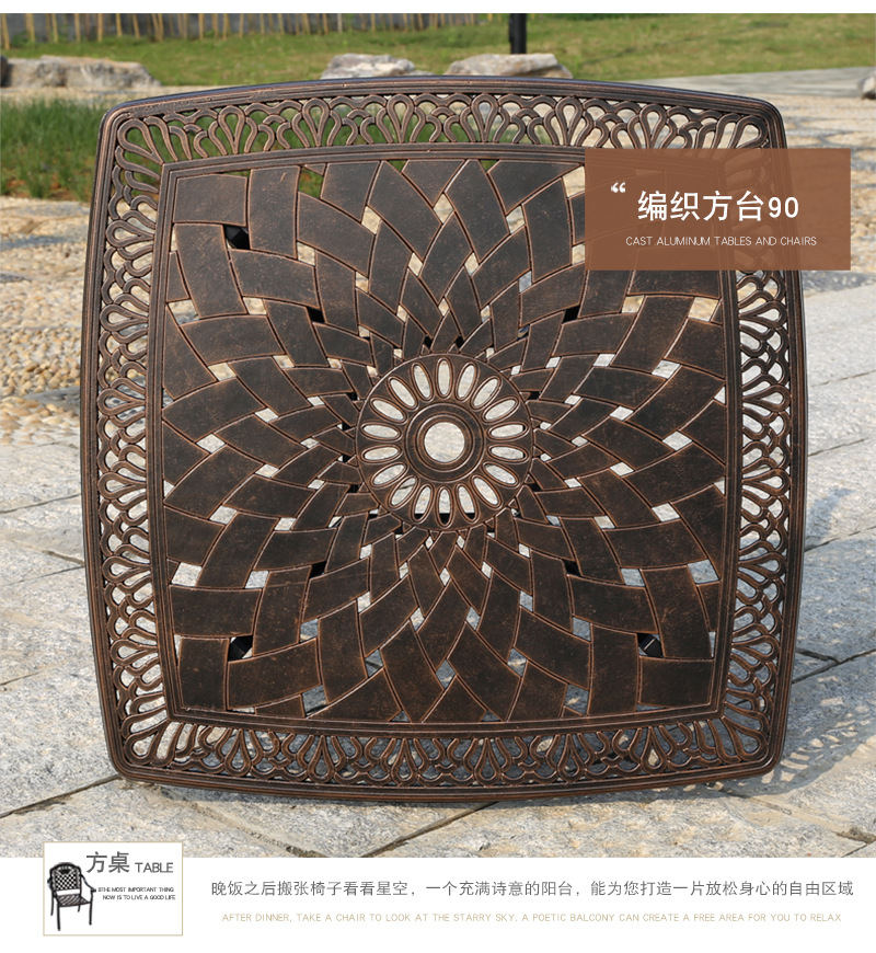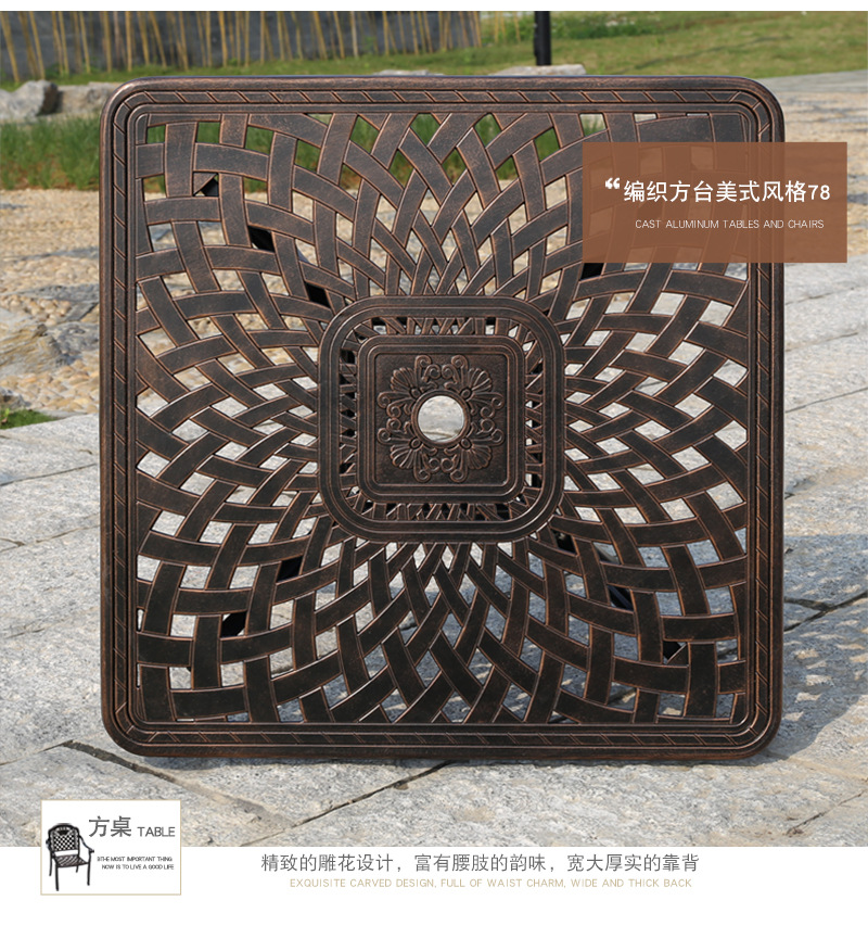 Bàn ghế ngoài trời sân vườn ghế giải trí bàn ghế sắt rèn nhôm đúc bàn ghế ăn ngoài trời Mục số: Dệt Thương hiệu: Baican Màu sắc: Bàn vuông dệt 78cm Kiểu Mỹ/Bàn vuông dệt 90cm/Bàn tròn dệt 90cm/Bàn tròn dệt 130cm Kiểu Mỹ/Bàn tròn dệt 106cm/Bàn dài dệt 162cm /Bàn góc Elizabeth 62cm/ Bàn góc Elizabeth 62cm Chất liệu: nhôm đúc Mẫu mã: Dù bện Dù xuất khẩu xuyên biên giới Nguồn cung cấp độc quyền: Không Phong cách: Hiện đại và đơn giản