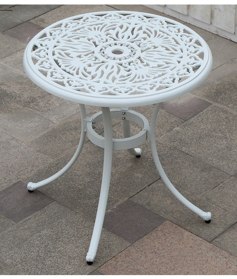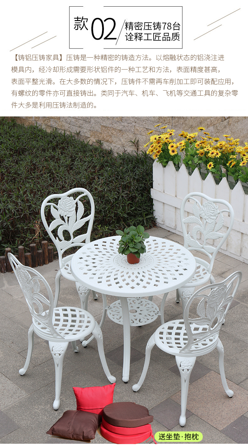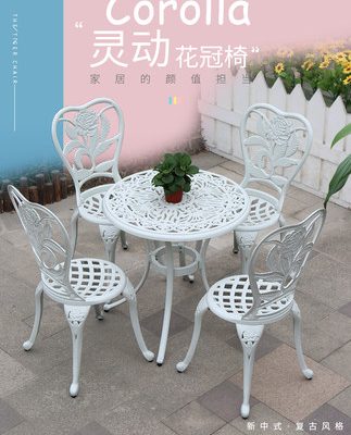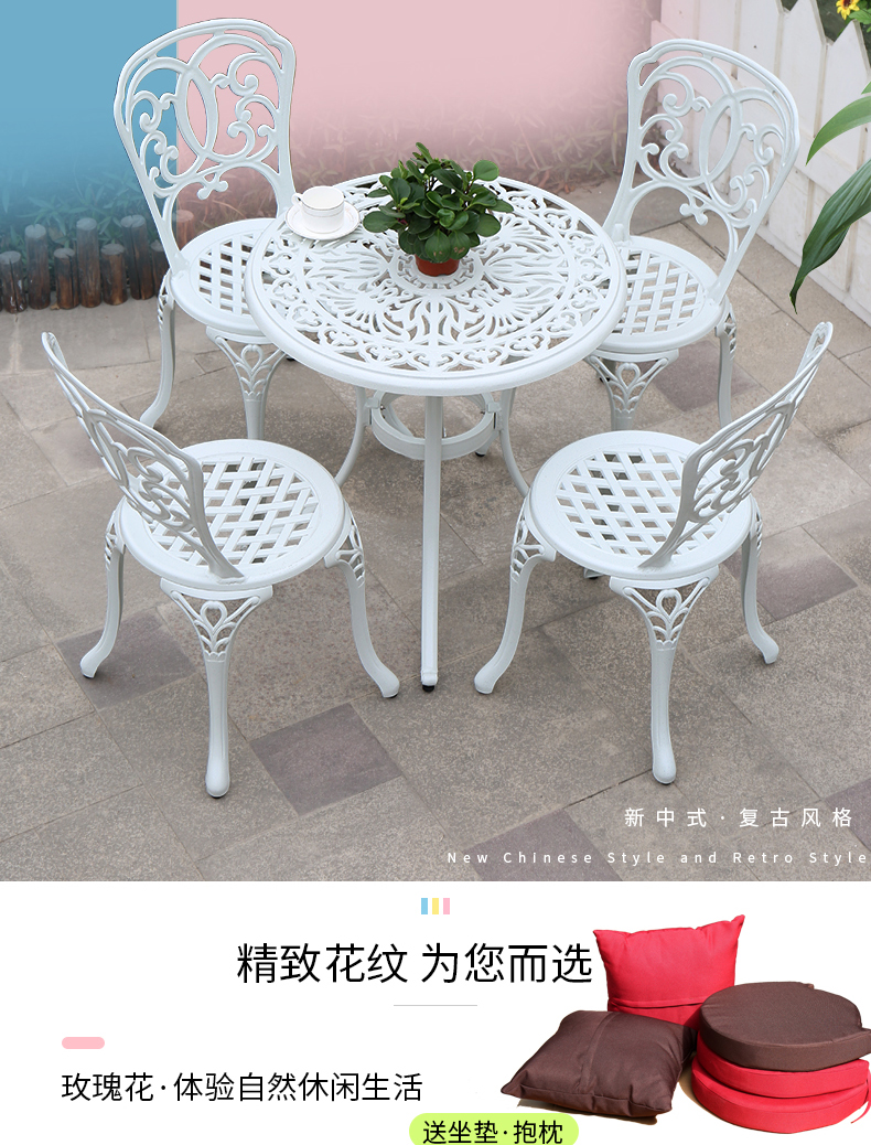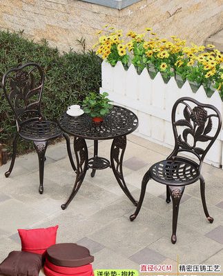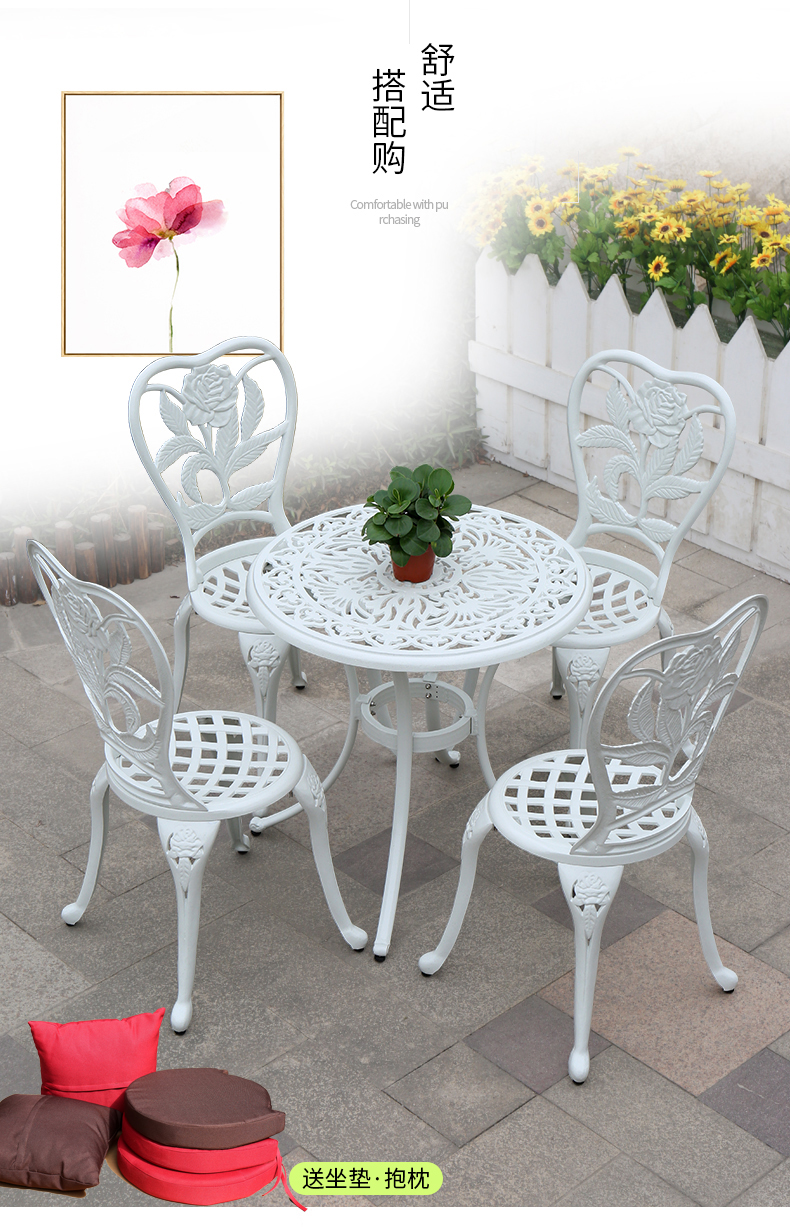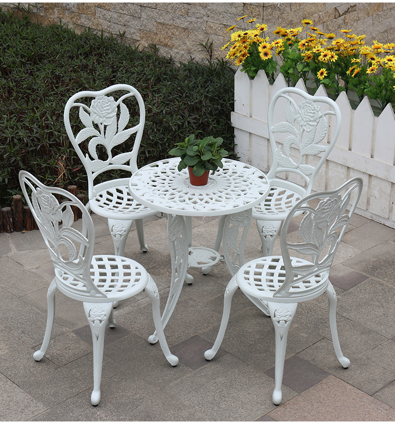 Bàn ghế nhôm đúc hoa văn hình hoa hồng tinh tế, sang trong.