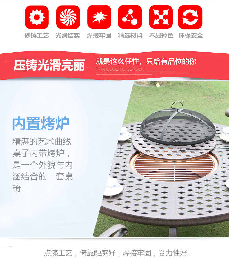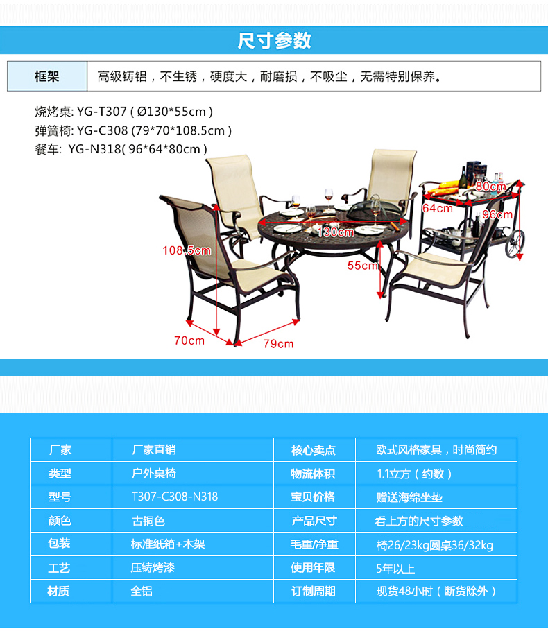 Bàn ghế nhôm đúc ngoài trời, kèm bếp nướng. Chuyên cung cấp bán buôn, bán lẻ các mặt hàng nhập khẩu trung quốc. Đồ ngoại thất, nội thất , các sản phẩm thiết bị đồ gia dụng, đồ nhà bếp….. Liên hệ 0346.246.292 Thông tin sản phẩm Thương hiệu: Aoqing Model: T307 + C308 Chất liệu chính: Nhôm Chức năng bổ sung: Cấu trúc đồ nội thất đa chức năng: cấu trúc khung Xuất xứ: Tỉnh Quảng Đông Khối lượng đóng gói: 0,5 Tổng trọng lượng: 150