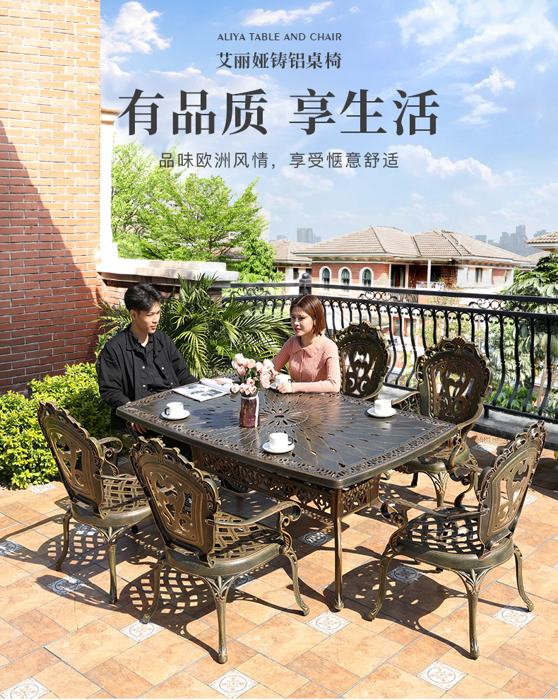 Bàn ghế nhôm đúc ngoài trời Mojia ngoài trời bàn ghế thư giãn ngoài trời sắt rèn bộ ngũ sự bàn ghế sân vườn ngoài trời là lựa chọn lý tưởng cho không gian công cộng, sân vườn hoặc khu đô thị. Sản phẩm giúp nâng cao hình ảnh chuyên nghiệp và sạch đẹp cho môi trường sống.