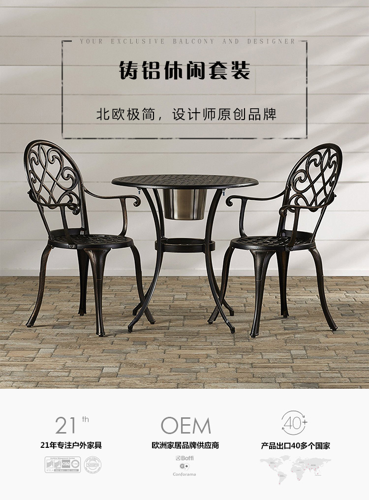 Bàn ghế nhôm đúc ngoài trời một bàn và hai ghế. là lựa chọn lý tưởng cho không gian ngoài trời hiện đại. Liên hệ ngay để được hỗ trợ nhập khẩu và tư vấn chi tiết.