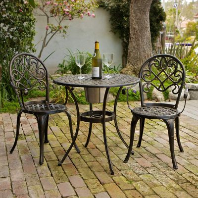 Bàn ghế nhôm đúc ngoài trời một bàn và hai ghế.
