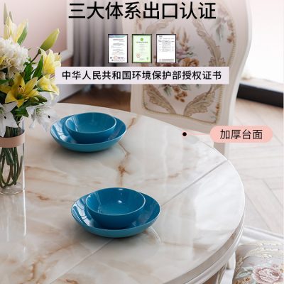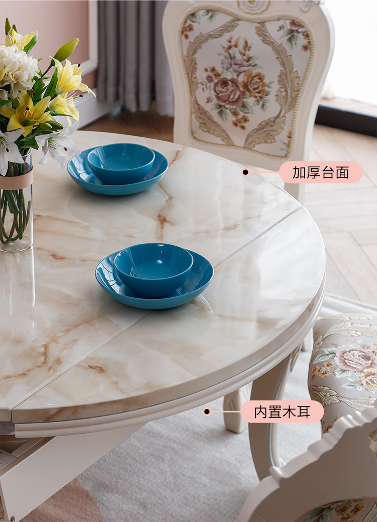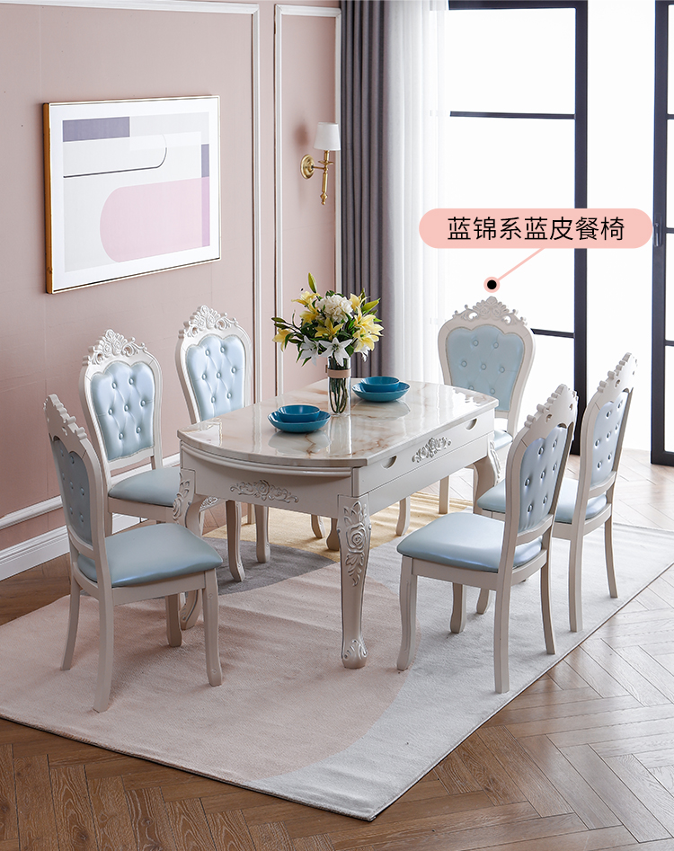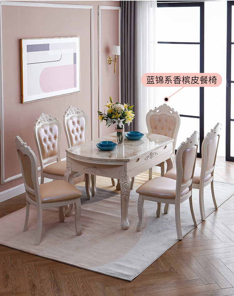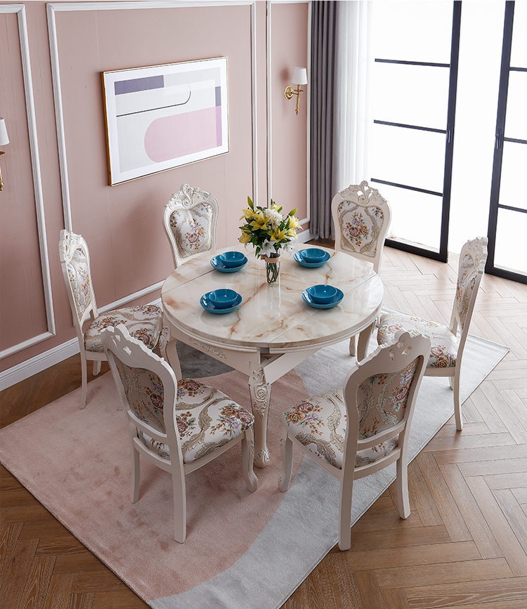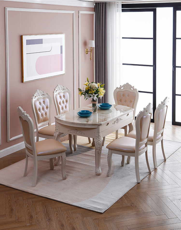 Bàn ghế phòng ăn nhập khẩu, phong cách châu Âu, sang trọng, bắt mắt. Mặt đá cẩm thạch tinh tế.