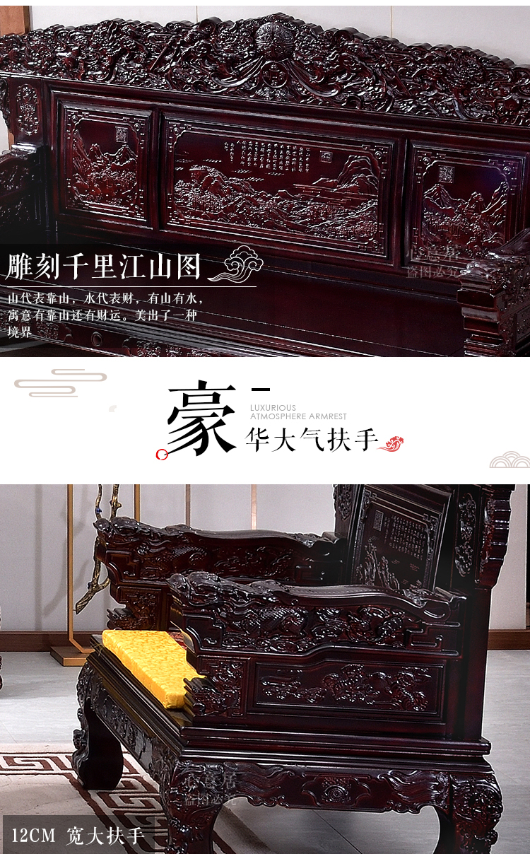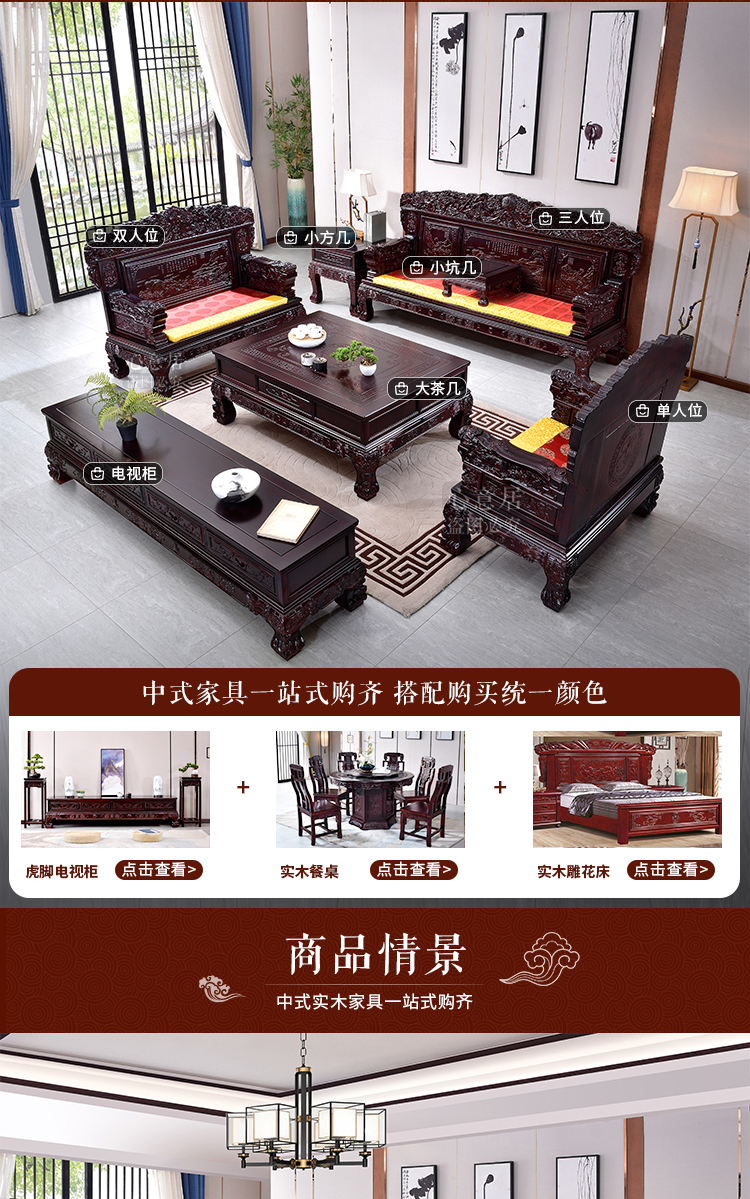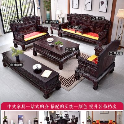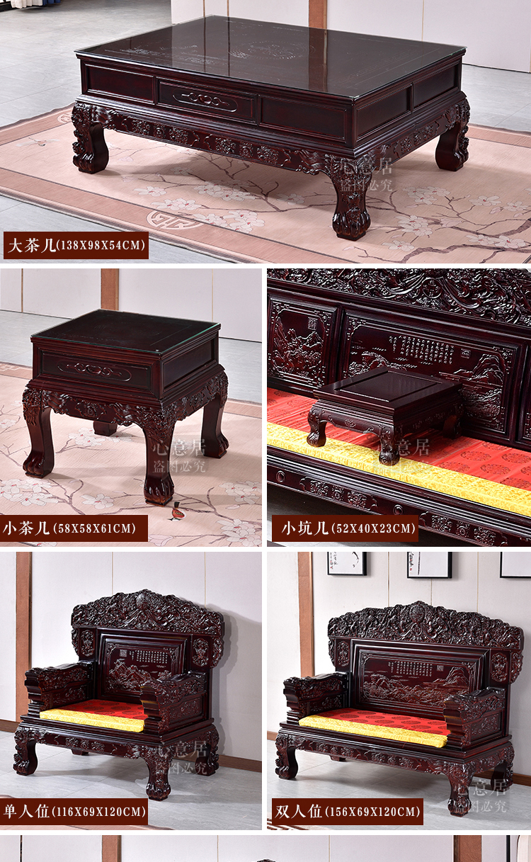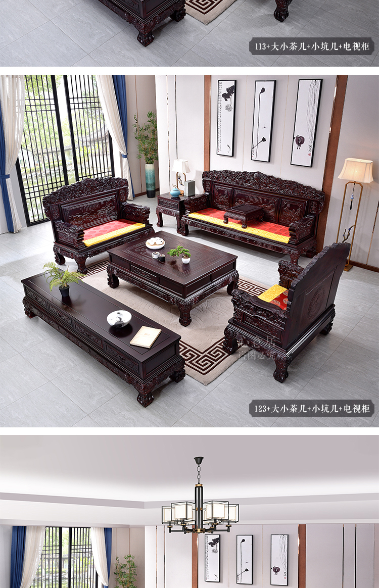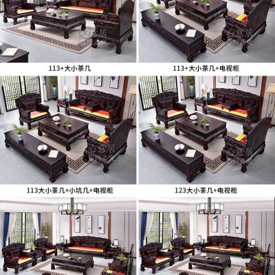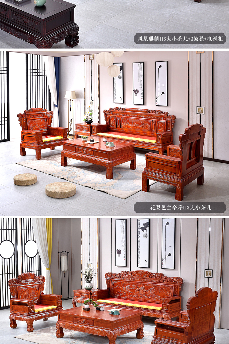 Bàn ghế phòng khách bằng gỗ rắn chạm khắc tinh tế.
