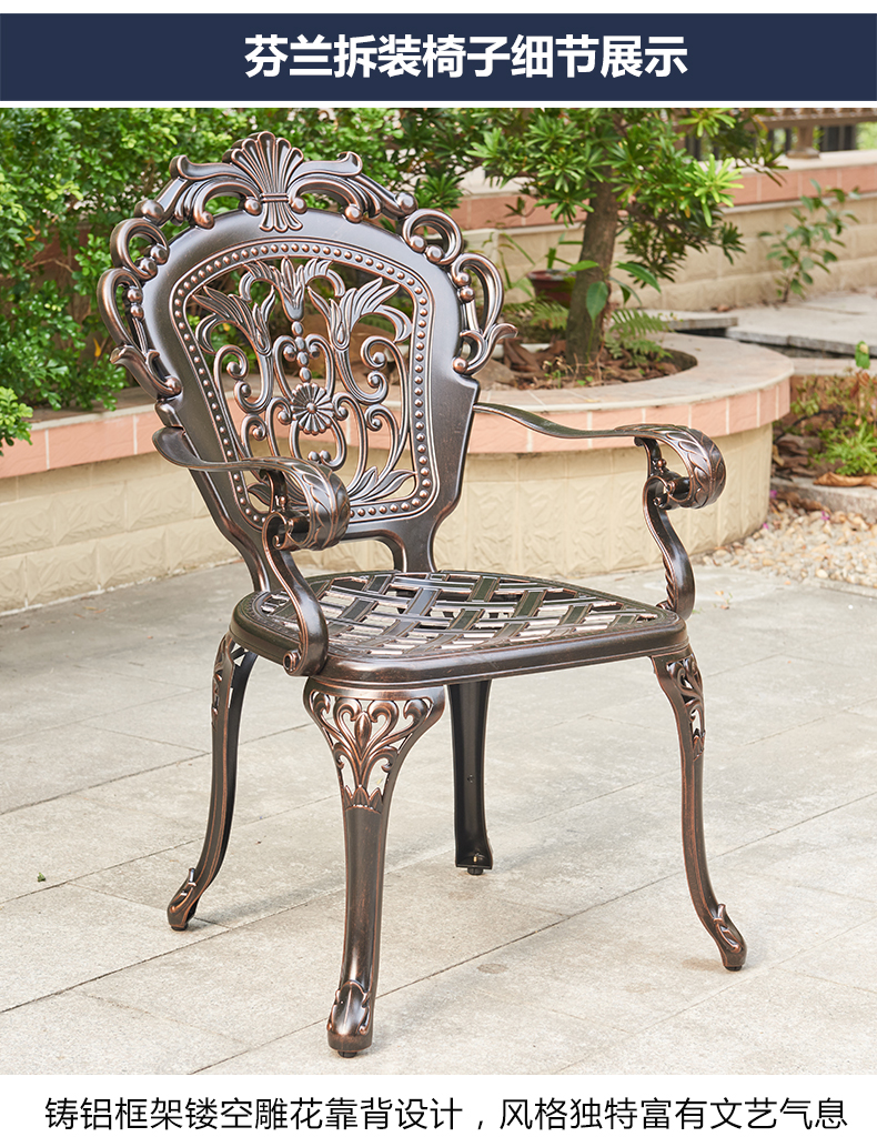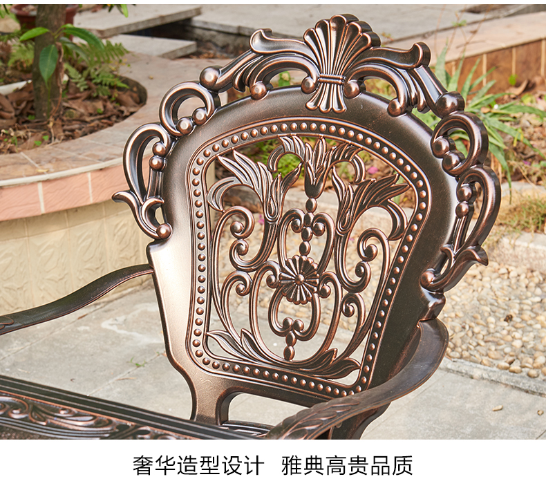 Bàn ghế sân vườn nhôm đúc nhập khẩu cao cấp 2 được thiết kế để tạo điểm nhấn cho khu vực sân vườn, ban công hoặc không gian ngoài trời.