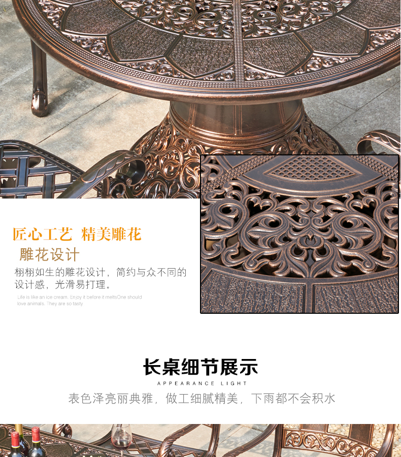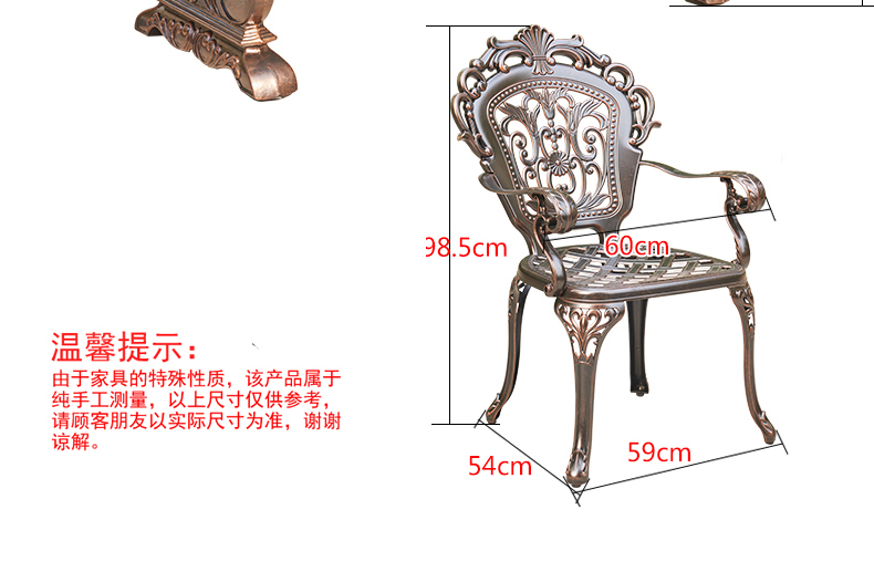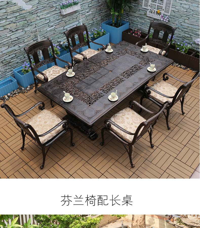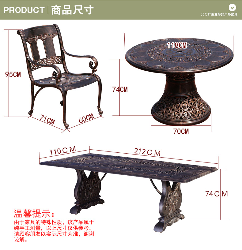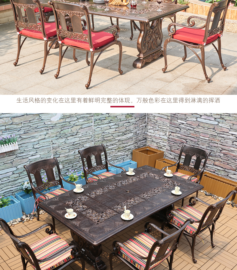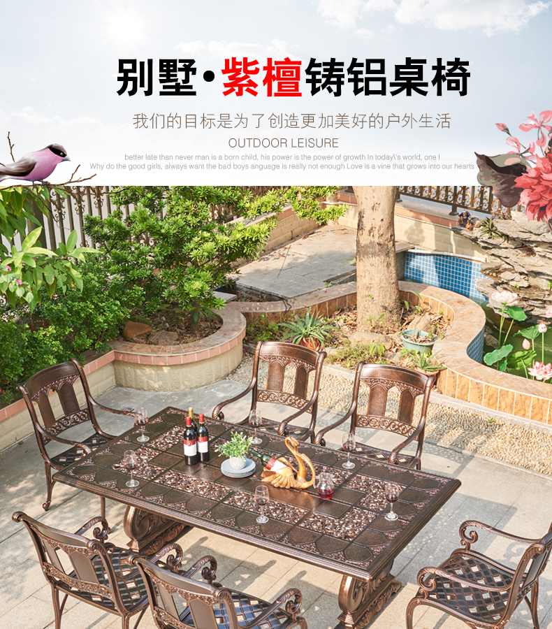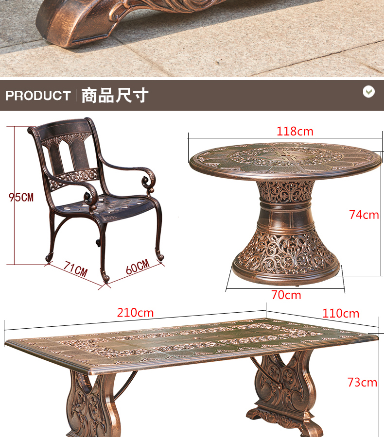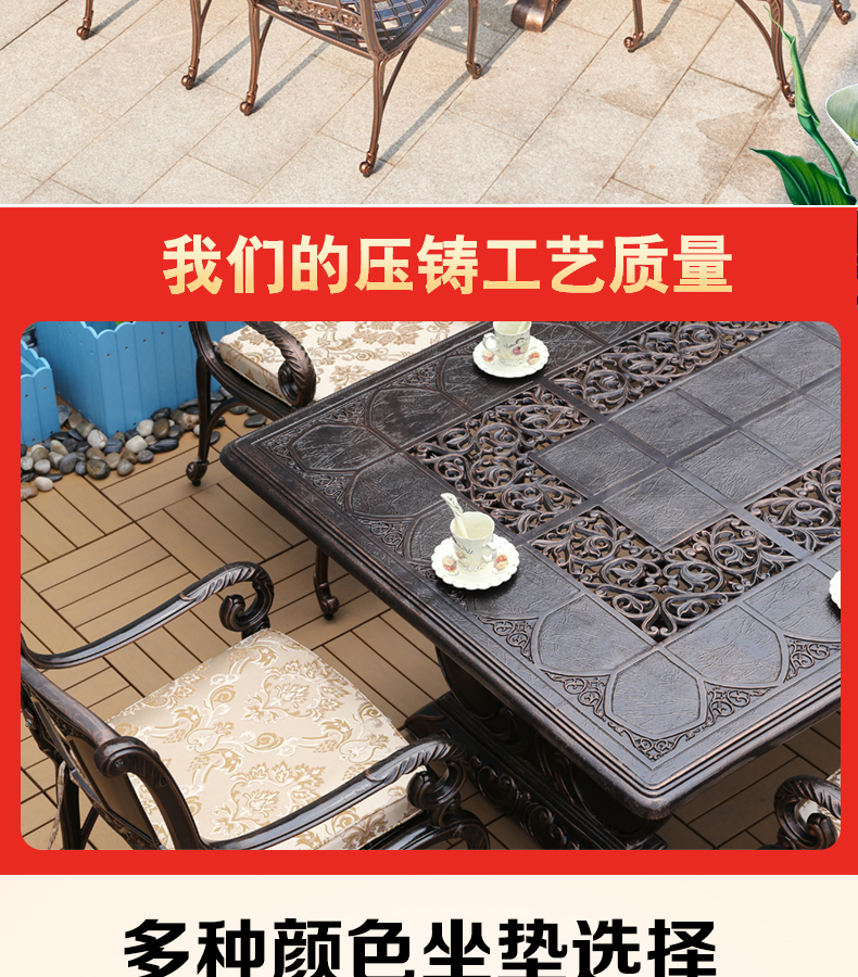 Bàn ghế sân vườn nhôm đúc sơn tĩnh điện nhập khẩu cao cấp. Sản phẩm cao cấp nhập khẩu từ Trung Quốc, nơi có truyền thống sản xuất lâu năm, công nghệ hiện đại và kinh nghiệm xuất khẩu hàng hoá. Bàn : 210*110*73mm. Trọng lượng 82kg. giá 16.500.000 VNĐ/ Chiếc Ghế : W60*D71*H95mm. Trọng lượng 17kg. giá 3.200.000 VNĐ/ Chiếc Hình ảnh bàn ghế sân vườn nhôm đúc sơn tĩnh điện nhập khẩu cao cấp CÂU HỎI THƯỜNG GẶP : VẬN CHUYỂN : Hàng hóa có được vận chuyển về tận nhà không ? => Hiện chúng tôi chỉ hỗ trợ vận chuyển trên những tuyến đường chính, tuyến quốc lộ Bắc Nam . Nếu nhà của quý khách ở cách xa những tuyến đường chính có thể liên hệ hỗ trợ vận tải ở địa phương. Đóng gói bàn ghế trước khi giao THANH TOÁN : Thanh toán sau có được không ? => Hiện tại chúng tôi chưa hỗ trợ thanh toán sau. Bởi chúng tôi không làm hàng sẵn để bán, khi có đơn đặt hàng chúng tôi mới bắt đầu làm hàng. Bởi vậy, nếu quý khách đặt hàng nhưng không nhận hàng chúng tôi phải chuyển sản phẩm thành nguyên liệu hoặc lưu kho trong thời gian dài. Hiện các đơn đặt hàng quý khách thanh toán trước 20% giá trị đơn đặt hàng và 80% còn lại thanh toán khi nhận hàng. BẢO TRÌ : Sản phẩm của chúng tôi có được hỗ trợ bảo trì không ? => Tùy từng mặt hàng chúng tôi có thể hỗ trợ sơn lại, đúc lại 1 số chi tết bị hỏng. Tuy nhiên chi phí bảo trì chúng tôi vẫn tính theo giá sản phẩm. PHỤ KIỆN : Có hỗ trợ các phụ kiện kèm theo ? => Hiện nay chúng tôi chỉ hỗ trợ các phụ kiện bằng gang , các phụ kiện bằng kính, gỗ, cao su thì tùy thuộc vào các nhà cung cấp lân cận. Tùy thuộc vào yêu cầu chúng tôi sẽ báo lại với quý khách cụ thể. Hình ảnh bàn ghế được nhập về kho tại Việt Nam Hình ảnh bàn giao và không gian của khách hàng Hình ảnh của nhà sản xuất Trung Quốc 品牌 型 号 包装细节 包装体积(立方)约 运费 法格莱旗舰店 FGL-L001 纸箱打木架 1.7立方 全国314城区包邮送货到楼下,详情请咨询客服 简 称 户外铸铝桌椅套装 产地 广东佛山 生 产 为保证产品质量,生产需要一定周期,发货时间请以与客服协商的发货时间为准,详情咨询客服 颜 色 古铜颜色 售后服务 有专业客服跟进,安装及使用过程遇到的问题,补发配件等等 商品材质 【铸铝特点】:户外专用,防水防晒,防腐蚀,不生锈。桌子椅子均为铸铝成型铸造,非常结实,不怕风吹雨打日晒,适合各种室外环境,且经久耐用!【静电喷粉,表面经220度高温烤漆,纹花电脑雕刻工艺精湛,高档大气】