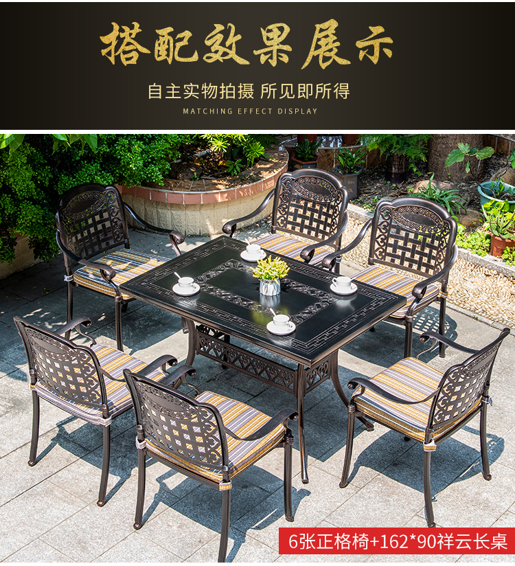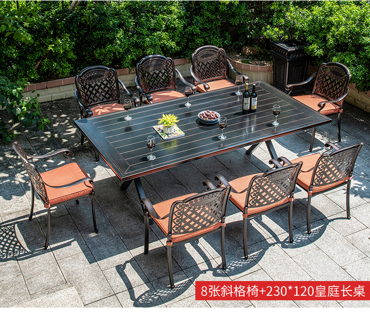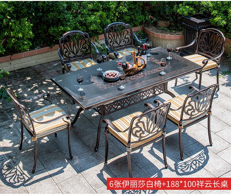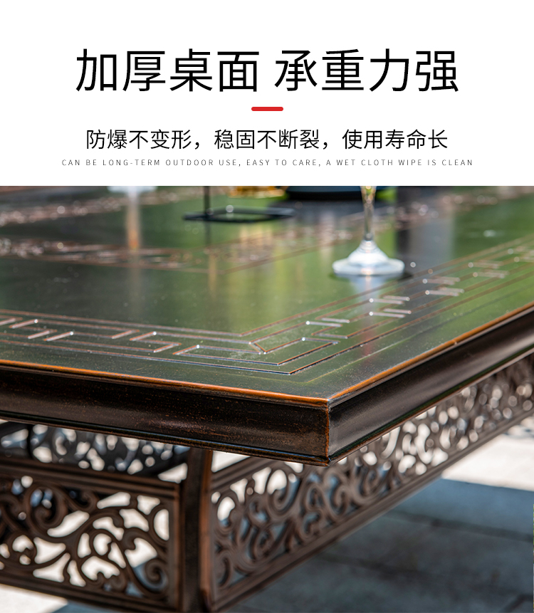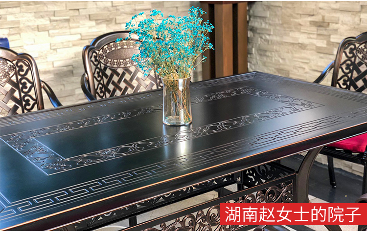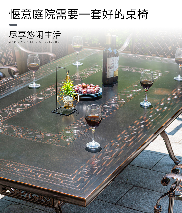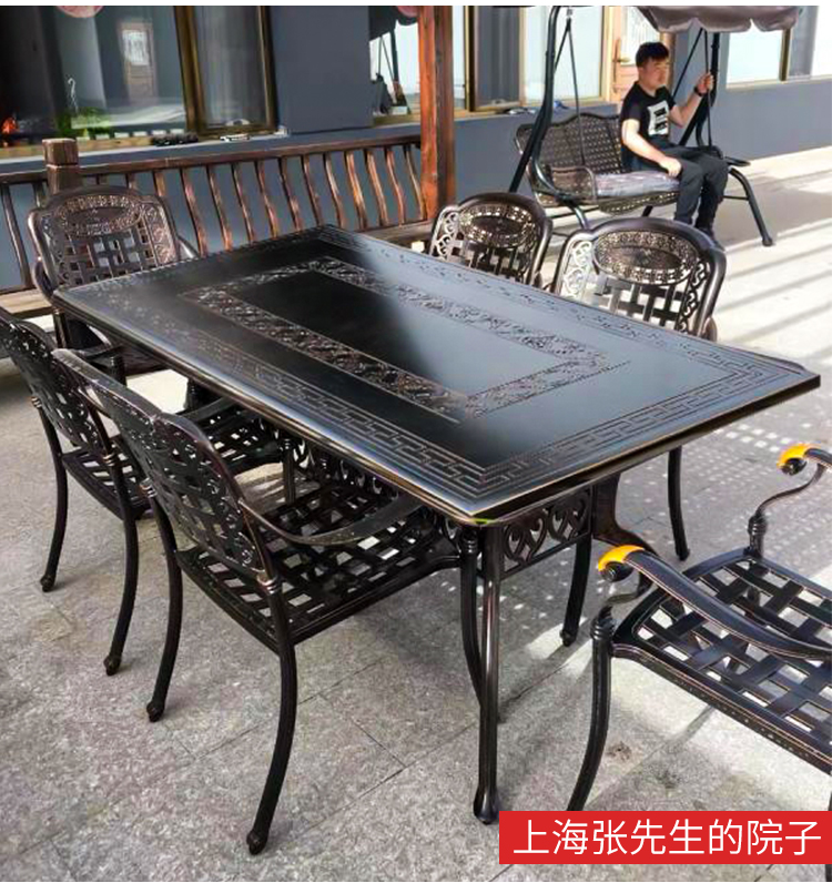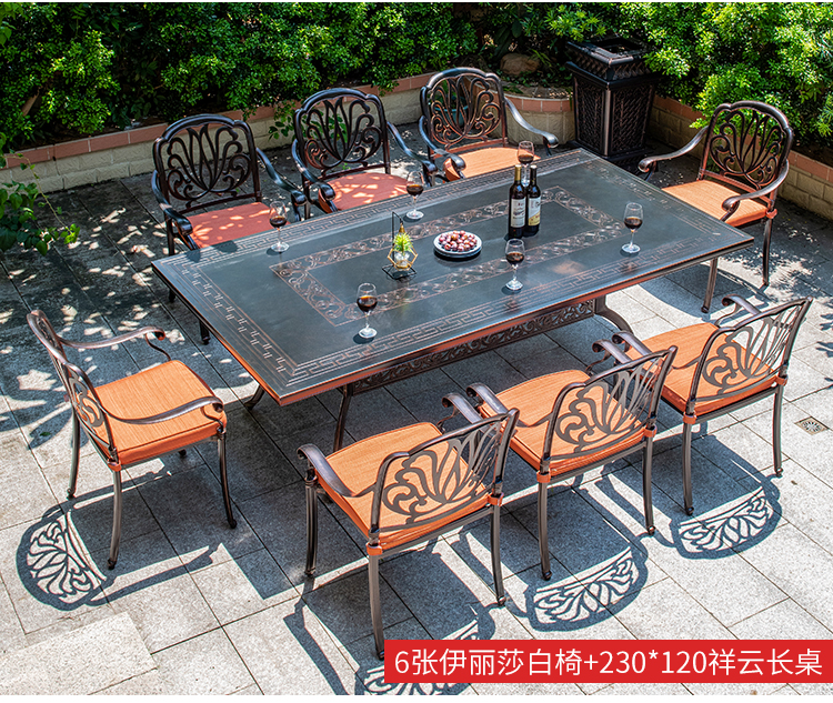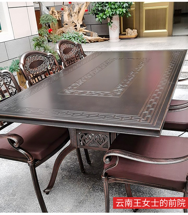Sản phẩm nổi bật với các đặc điểm: Shuyi ngoài trời nhôm đúc chạm khắc bàn ghế kết hợp bàn ăn dài và ghế biệt thự ngoài trời sân vườn sân thượng bàn lớn