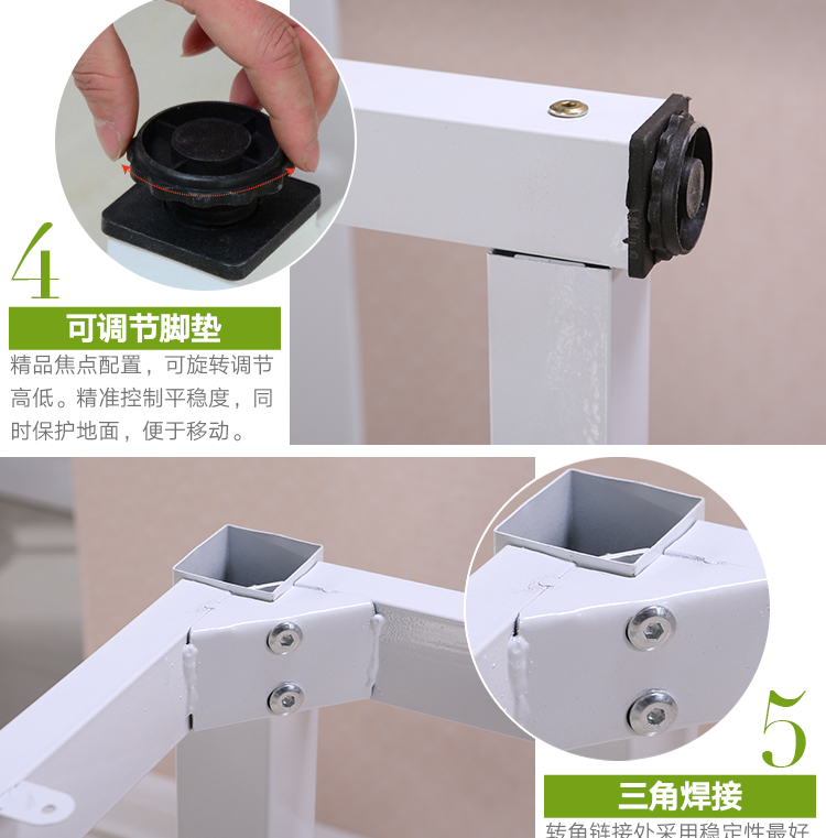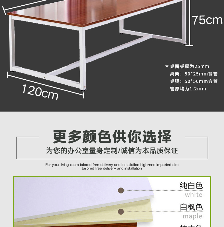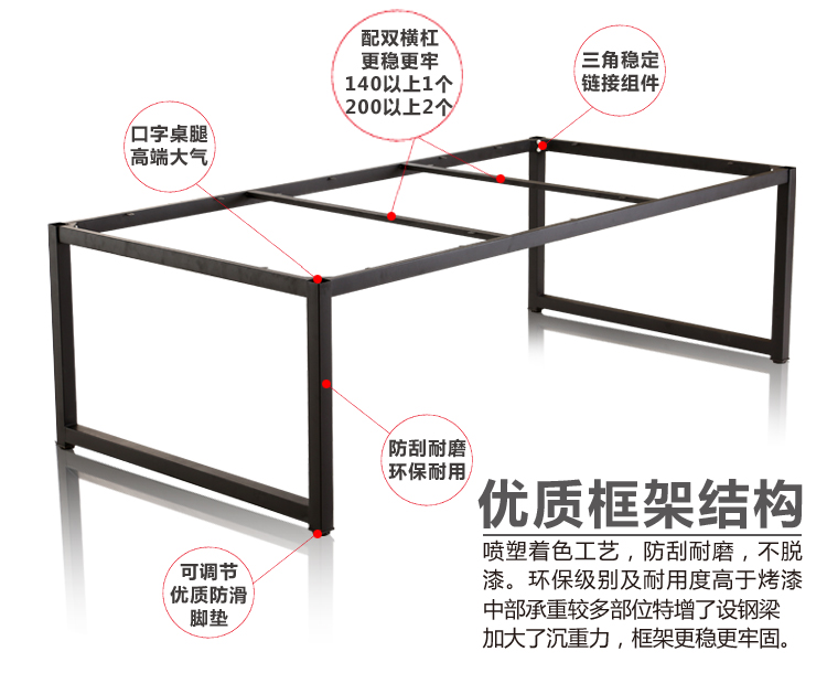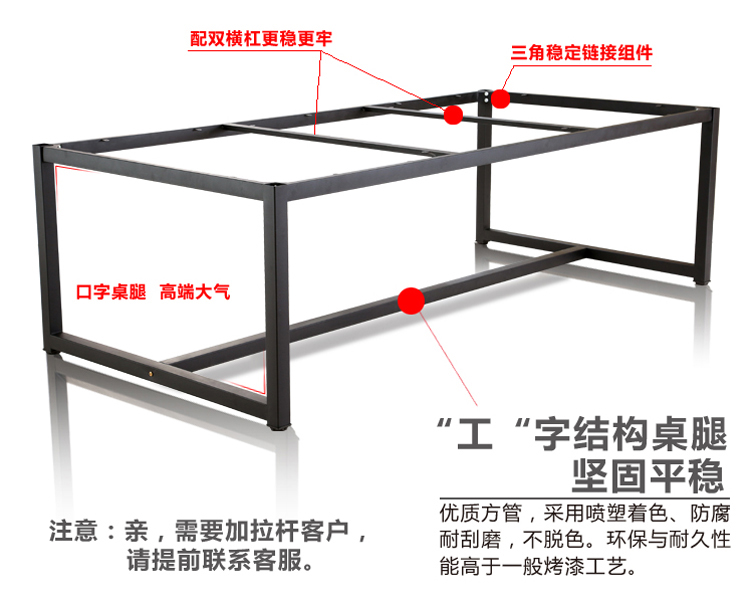 材质:支架桌腿采用,全新镀锌钢材,烤漆,饰面采用国家标准免漆板材,无任何异味,安全环保!规格:桌腿采用50mm*50mm方管,桌架采用25mm*50mm方管桌面加厚型2.5厘米厚度板材!