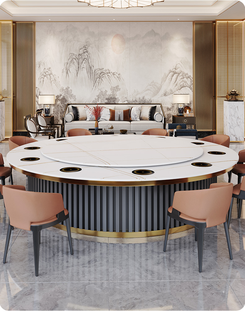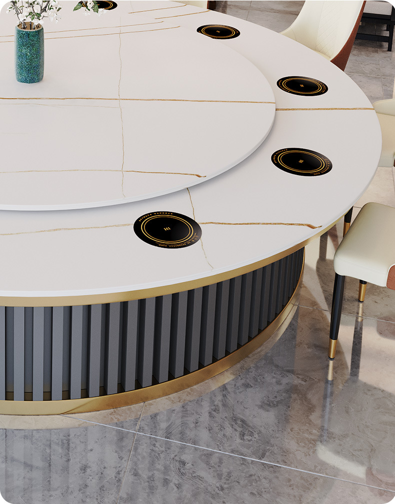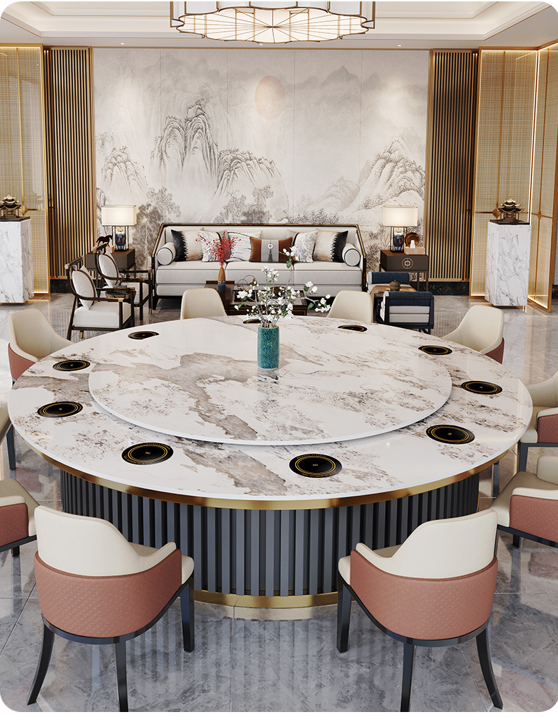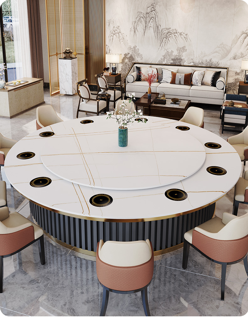 Bàn lẩu tấm đá bếp điện từ tích hợp khách sạn doanh nhân Bàn ăn tròn tiệc với bàn xoay khách sạn bàn tròn lớn là sản phẩm nổi bật trong dòng bàn ăn nhập khẩu, thiết kế hiện đại và sang trọng, phù hợp với nhiều không gian nội thất cao cấp.