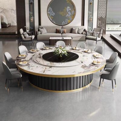 Bàn lẩu tấm đá bếp điện từ tích hợp khách sạn doanh nhân Bàn ăn tròn tiệc với bàn xoay khách sạn bàn tròn lớn là sản phẩm nổi bật trong dòng bàn ăn nhập khẩu, thiết kế hiện đại và sang trọng, phù hợp với nhiều không gian nội thất cao cấp.