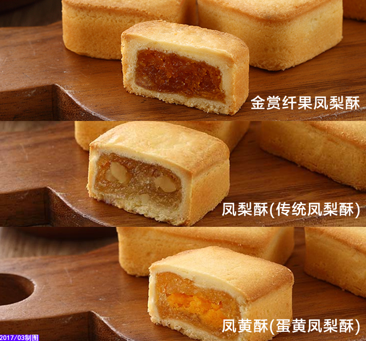 金赏土凤梨酥採17号金馔凤梨馅,吃得到凤梨的纤维果肉! 凤黄酥采用凤梨馅和香香的蛋黄馅制成,味道赞!凤梨酥严选当季凤梨入馅,加上核桃增添丰富口感,酥 软 香!