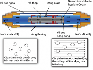 Khi nước đi qua khoảng xử lý của thiết bị Xung từ Superior, các khoáng chất hòa tan trong nước sẽ bị tác động bởi chuỗi các từ trường đa cực làm phân cực các phân tử CaCO3 và MgCO3, khiến chúng chuyển động thành dòng. Thay vì bám dính vào nhau và hình thành mảng bám, các phân tử liên tục đẩy nhau, từ đó cặn sẽ kết tủa trong trạng thái mềm hơn bình thường, lơ lửng được gọi là dạng Aragonit, tạo thành một lớp siêu mỏng bám trên đường ống giúp đường ống không bị ăn mòn. Dòng nước dưới tác dụng của thiết bị Superior, các phân tử nước bị nhiễm từ, theo đó, thay vì chuyển động hỗn độn, các phân tử nước chuyển động theo hướng như hình dưới.