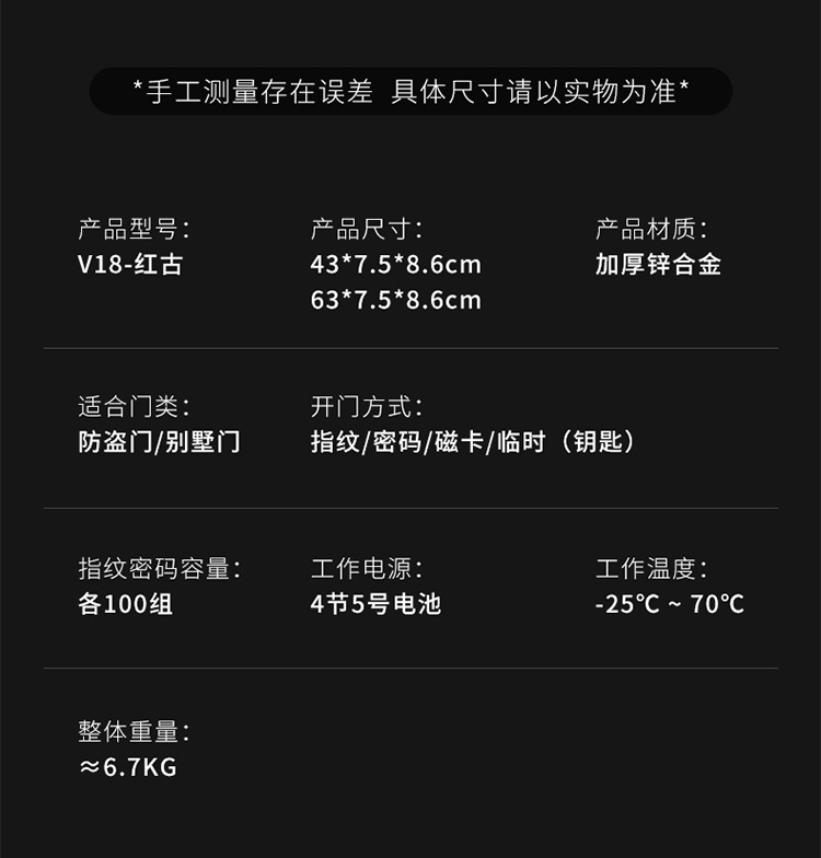 Dung lượng lưu trữ vân tay: 100 Mã sản phẩm: V18 Thương hiệu: Yunman Tuổi thọ: 5000 Nguồn điện: DC Model: V18 Thời gian quét <: 0,5 Phạm vi ứng dụng: Cổng biệt thự, cửa an ninh, cửa gỗ, cửa hợp kim nhôm Thông số kỹ thuật: V18 dài/V18 Loại dài [cho cửa đôi]/Kiểu ngắn V18/Kiểu ngắn V18 [cho cửa đôi]/Kiểu ngắn V18 [cho cửa đôi] Tỷ lệ nhận dạng sai <: 1 Có giao hàng tận nơi không: giao hàng xuống tầng dưới Có cung cấp lắp đặt không dịch vụ: không Phương pháp kết hợp: 1: N Nhiệt độ làm việc: -10-50 Độ ẩm làm việc: 10-90 Tùy chỉnh xử lý: Không Tỷ lệ từ chối <: 1 Cho dù nguồn cung cấp độc quyền xuất khẩu xuyên biên giới: Không Phong cách: Phong cách Mỹ: Nắp trượt/vân tay /password/ Với chìa khóa/lỗ nhìn trộm trực quan/nhận dạng khuôn mặt/mở khóa từ xa/số lần mở khóa mở khóa từ xa>:50000000