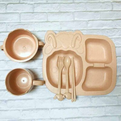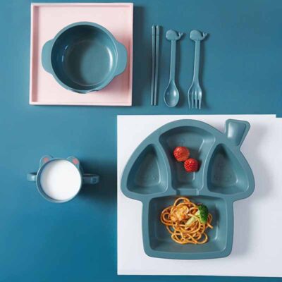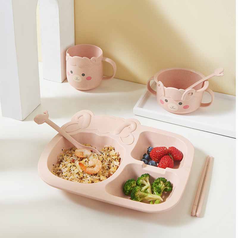 Bộ 6 món hoạt hình dành cho trẻ em Bộ bữa ăn hương lúa mì chia đĩa bát cốc muỗng nĩa đũa bé mẫu giáo chống rơi đĩa ăn trưa