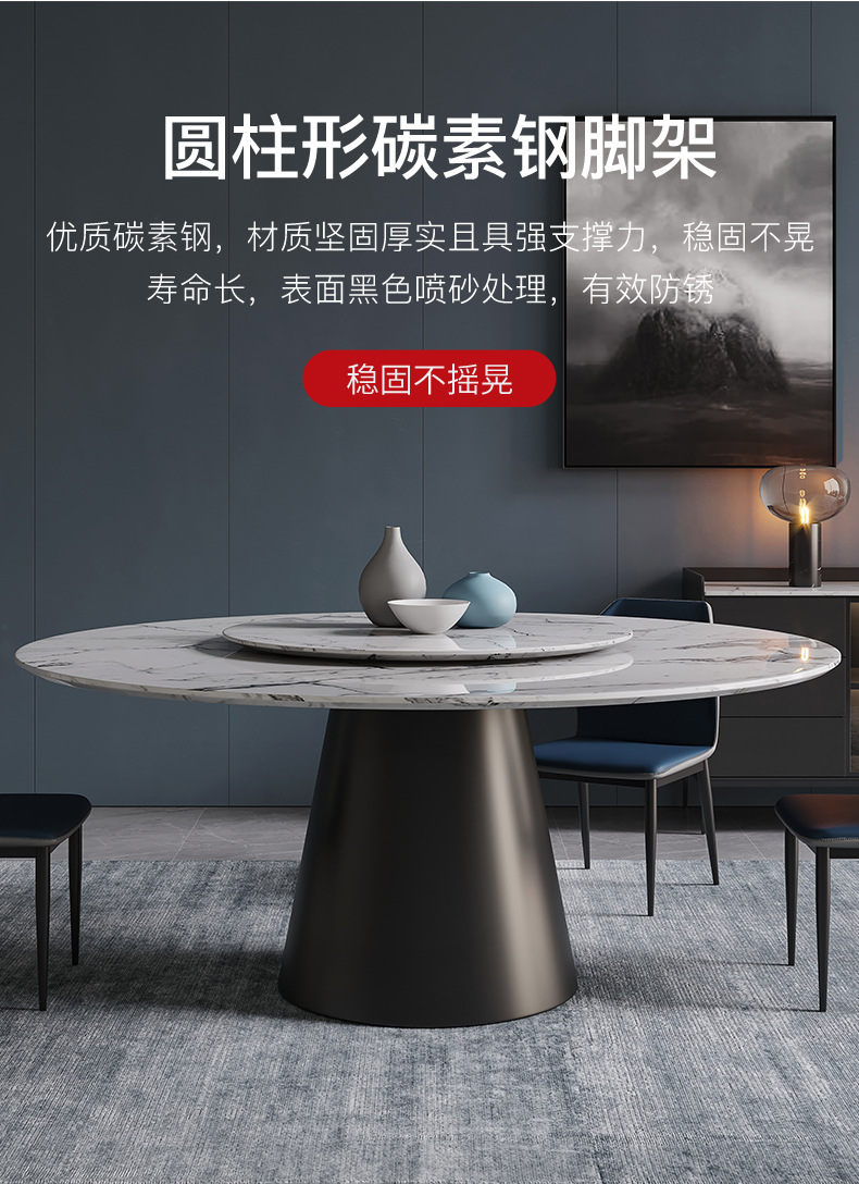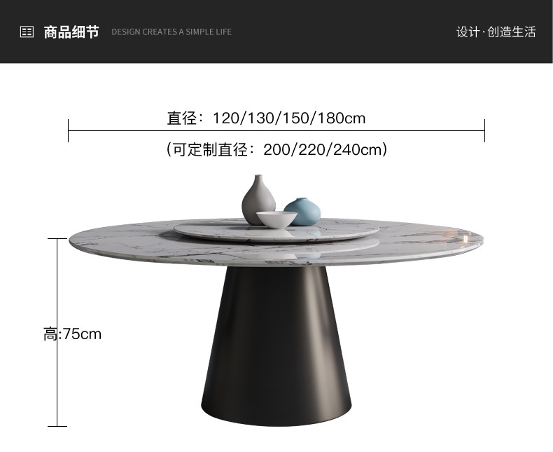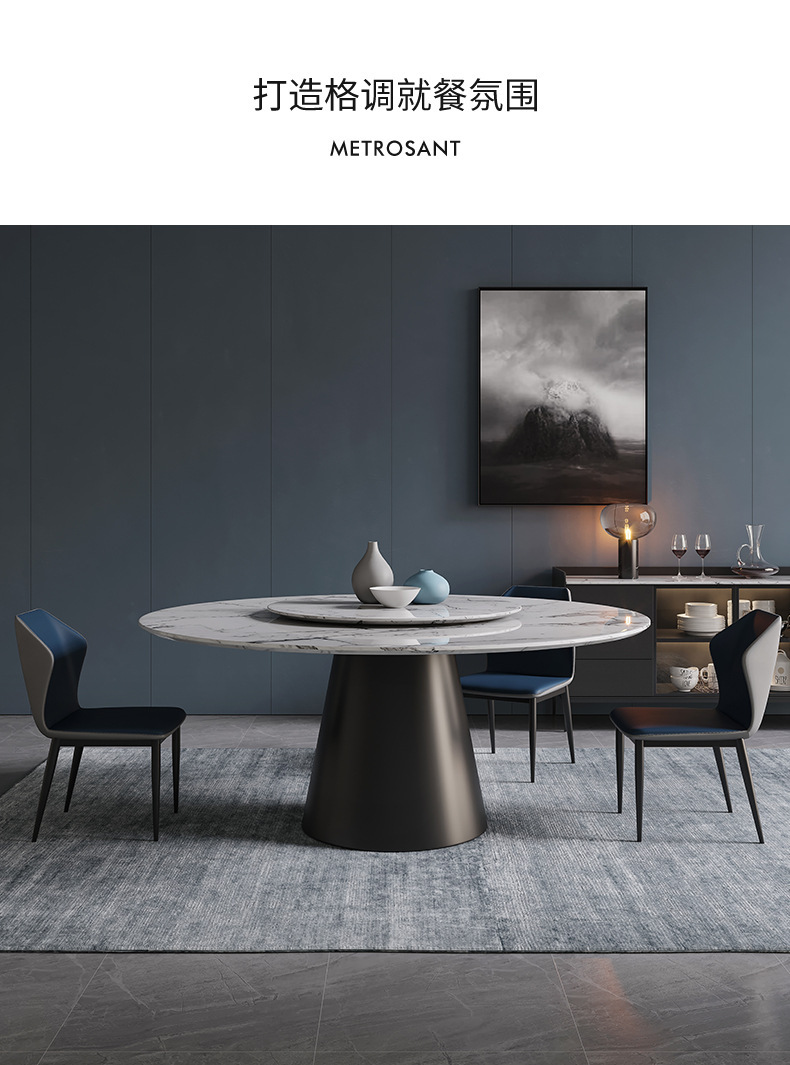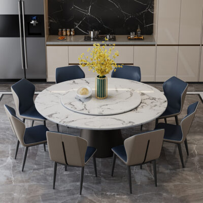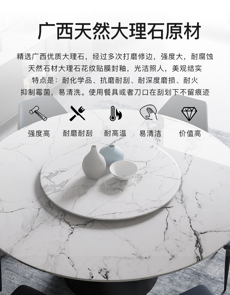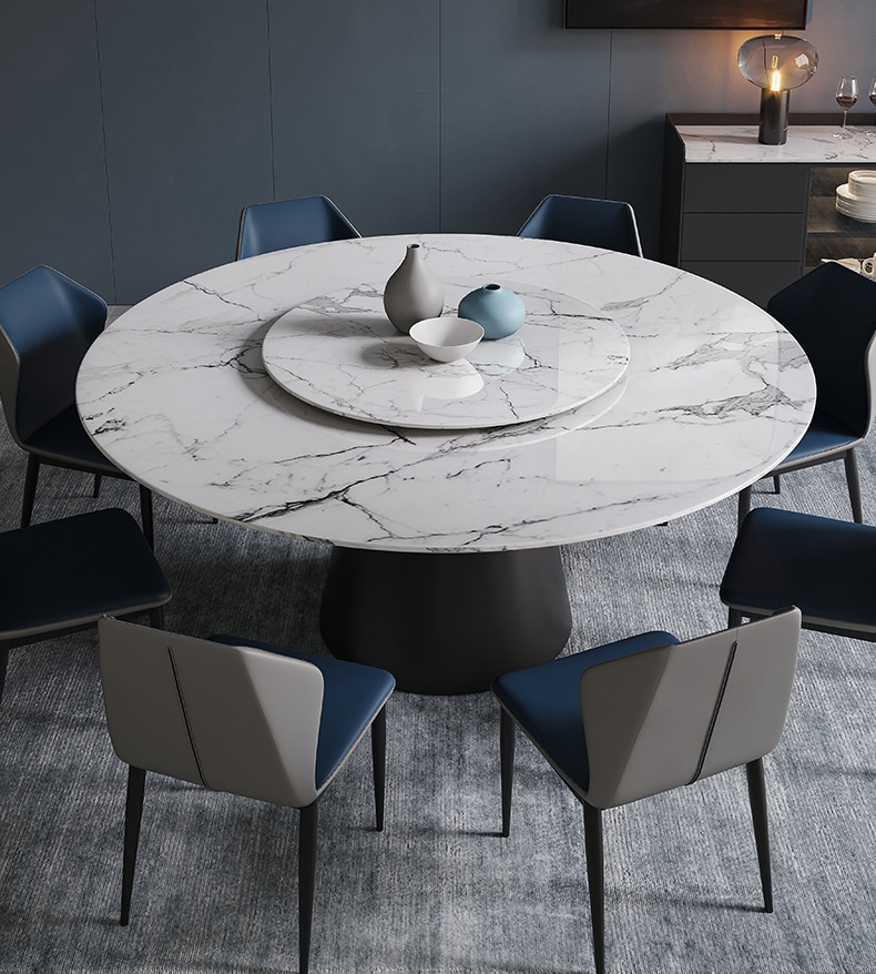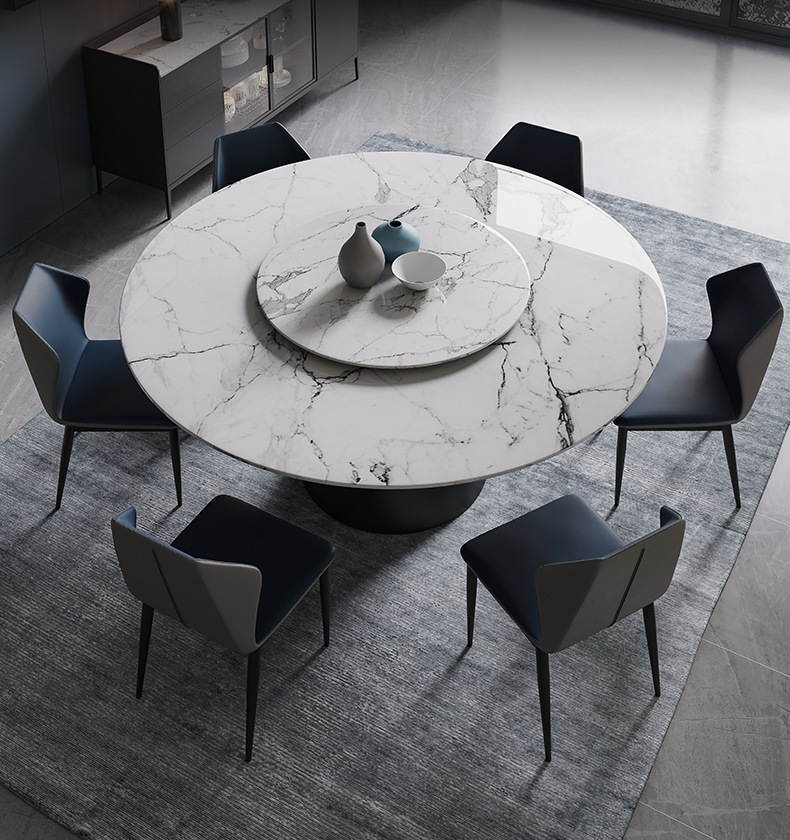 Bộ bàn ghế ăn bằng đá cẩm thạch sang trọng nhẹ kiểu Ý kết hợp khách sạn gia đình lớn nhỏ hộ gia đình bàn cơm đá phiến tròn có bàn xoay là sản phẩm nổi bật trong dòng bàn ăn nhập khẩu, thiết kế hiện đại và sang trọng, phù hợp với nhiều không gian nội thất cao cấp.