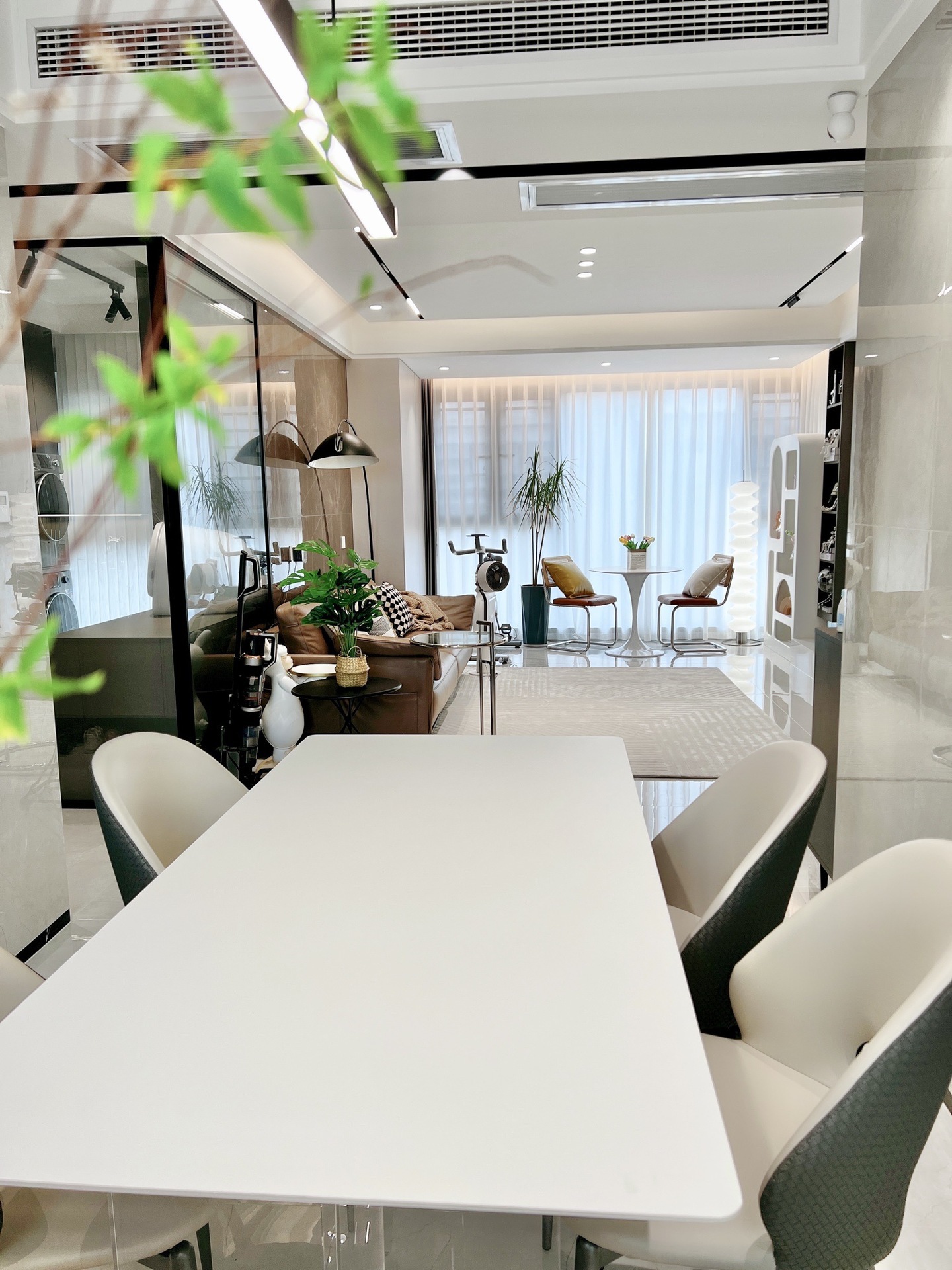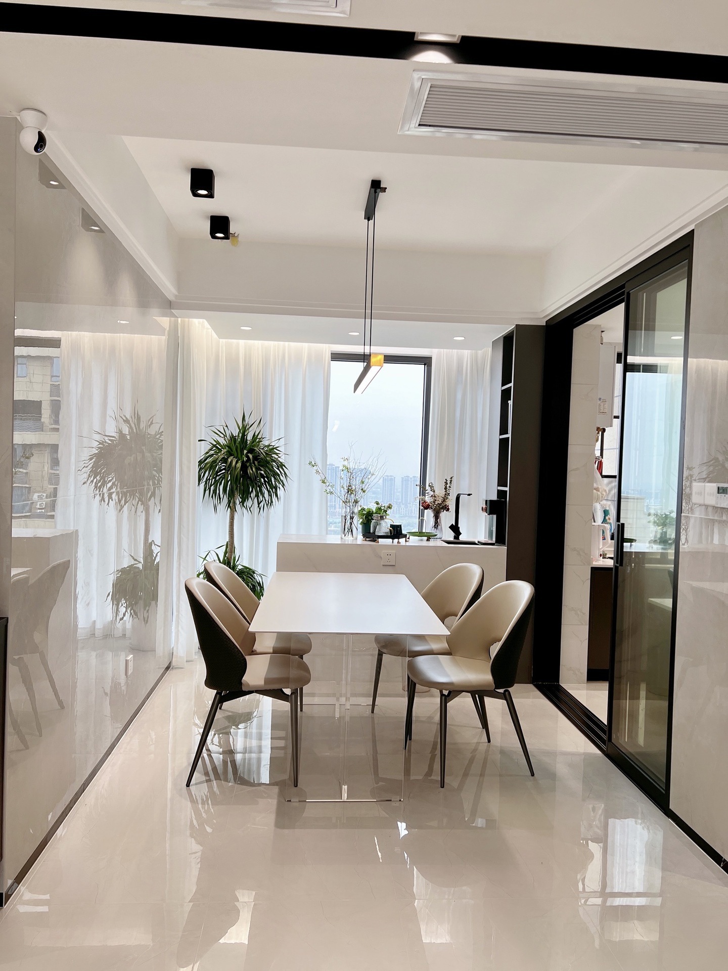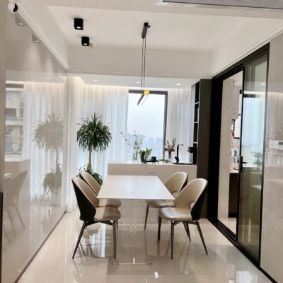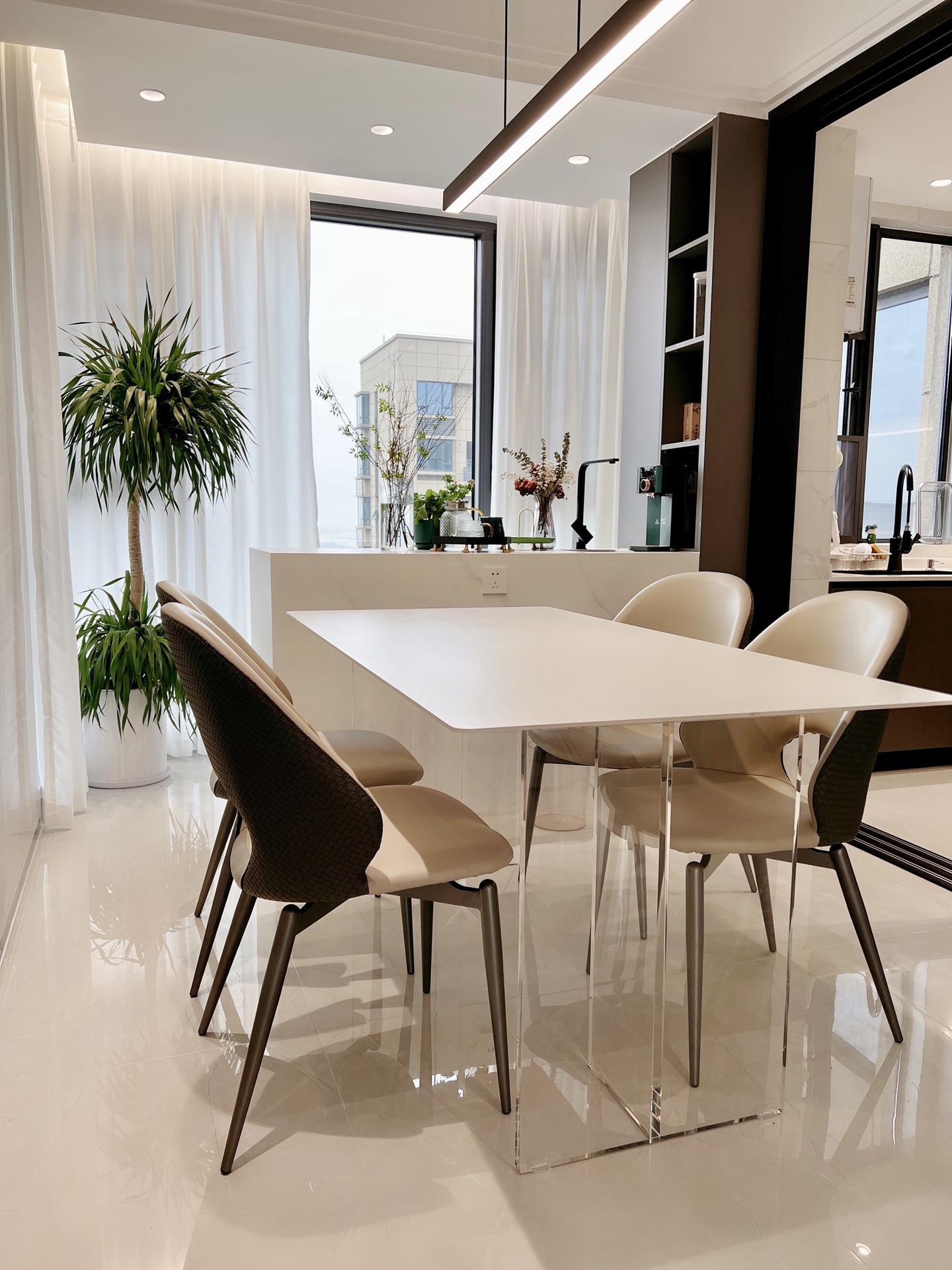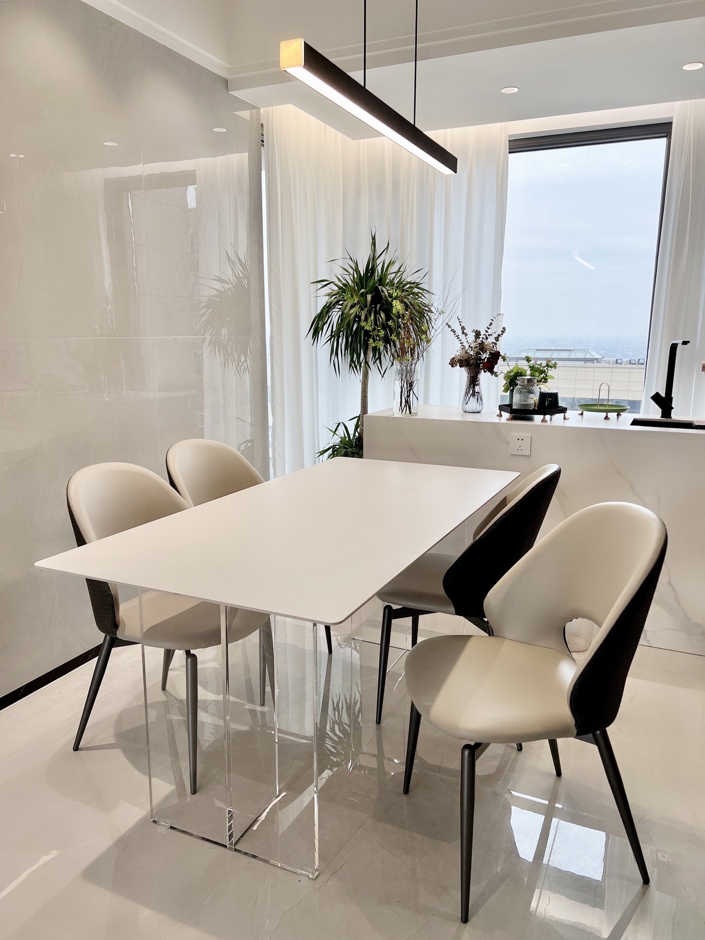 Bộ bàn ghế ăn bằng đá phiến trắng treo bằng acrylic, đặt phòng nhỏ hình chữ nhật, bàn ăn gia đình đơn giản kiểu kem.