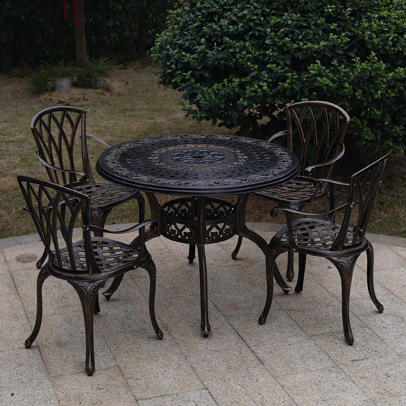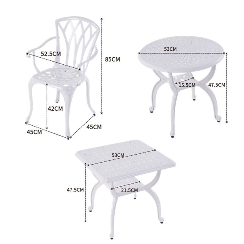 Bộ bàn ghế giải trí ngoài trời bằng nhôm đúc có tay vịn sắt rèn sân vườn sân biệt thự ban công kim loại bộ ba món được thiết kế để tạo điểm nhấn cho khu vực sân vườn, ban công hoặc không gian ngoài trời.