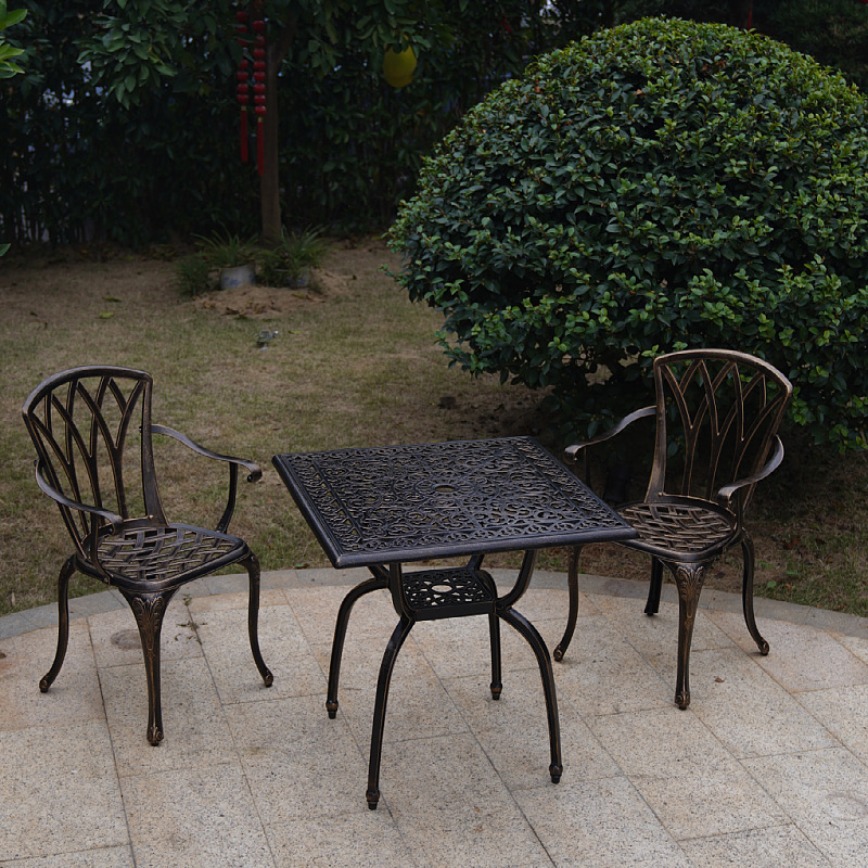 Bộ bàn ghế giải trí ngoài trời bằng nhôm đúc có tay vịn sắt rèn sân vườn sân biệt thự ban công kim loại bộ ba món được thiết kế để tạo điểm nhấn cho khu vực sân vườn, ban công hoặc không gian ngoài trời.
