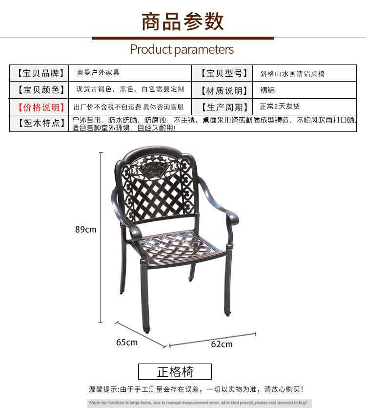 Bộ Bàn Ghế Nhôm Đúc Ngoài Trời Bộ Kết Hợp Ban Công Biệt Thự Châu Âu Sân Vườn Ngoài Trời Sân Vườn Bàn Ghế Sắt Rèn Nội Thất Giải Trí Mục số: Ghế tranh phong cảnh lưới xiên là chung Người nộp thuế: Không Màu sắc: kết hợp ghế 1:4 + bàn vuông dệt 78*78*H73/ghế 2:4 + bàn vuông vân gỗ 81*81*H75/tổ hợp 3: 4 ghế + Bàn tròn vân gỗ đường kính 83*H75/kết hợp 4:4 ghế+90*90*H76 bàn vuông gạch trắng/kết hợp 5:4 ghế+đường kính 100*H75 bàn tròn/kết hợp gạch trắng 6:4 ghế+ đường kính 90*H73 Bàn tròn dệt/kết hợp Ghế 7:4+bàn vuông dệt/kết hợp 90*90*H73 Ghế/kết hợp 8:4+đường kính 80*H73 bàn hoa lan/kết hợp Ghế/ghế 9:4+đường kính 100*H73 bàn hoa lan/kết hợp Ghế 10:4 + Bàn gạch khung nhôm 90*90*H75/bộ ghế 11:4 + đường kính 90*H73 Bàn tròn Elizabeth/bộ ghế 12:4 + đường kính 100*H73 Bàn tròn cọ/bộ ghế 13:4 + đường kính 94 *Gạch đỏ viền nhôm H73/Tổ hợp/bàn tròn 14:4 ghế+90*90*H75 bàn vuông/tổ hợp gạch đỏ viền nhôm 15:4 ghế+đường kính 90*H73 Bàn tròn/tổ hợp gạch trắng 90*H73/ghế 16:4+đường kính Bàn gạch trắng 100*H73/ Tổ hợp 17:6 ghế+160*90*H73 bàn dài/kết hợp gạch trắng ore 18:6 ghế+gạch viền nhôm 188*98*H75 vỉ nướng điện/kết hợp 19:4 ghế+đường kính 106 *Bàn nướng H73/ Tổ hợp ghế 20:6 + đường kính 122 *Bàn tròn Sears/tổ hợp 21:6 ghế + đường kính 120*Bàn tròn Zhuoman/tổ hợp 22:8 ghế + đường kính 150*Bàn tròn thường H73/tổ hợp 23: 6 ghế + 160* 90 * H73 bàn gạch khung nhôm/kết hợp 24:6 ghế + 175*90*H73 bàn dài xiên/kết hợp 25:6 ghế + 152*94*H75 gạch đỏ bàn nướng điện/kết hợp 26:6 ghế + Bàn nướng điện nhôm đúc 150*90 *H74/tổ hợp ghế 27:6+ghế lưới xiên 150*90*H73/tổ hợp ghế 28:6+ghế/tổ hợp khắc tấm nhôm 150*90*H73 29:6 ghế+150 *90*H73 bàn gạch đỏ với cạnh/kết hợp nhôm 30:8 ghế+188*98*H75 băng ghế cạnh nhôm/kết hợp 31:8 ghế+213*106*H73 Ghế băng/kết hợp Hills 32:6 Ghế+ Bàn dài bện hình bầu dục 180 * 105 * H73 / kết hợp Ghế 33: 8 + Bàn thường hình bầu dục 210 * 105 * H73 / 4 ghế đơn / 4 ghế đơn Chất liệu: hợp kim nhôm Kiểu dáng: gia công ghế sơn phong cảnh xiên Phương pháp:.Thông số kỹ thuật: Ghế: 62*65*H89 Có cung cấp độc quyền xuất khẩu xuyên biên giới hay không: Không Phong cách: Hiện đại và đơn giản Có giao hàng tận nơi hay không: Giao hàng xuống tầng dưới Có cung cấp dịch vụ lắp đặt hay không: Không