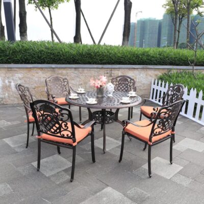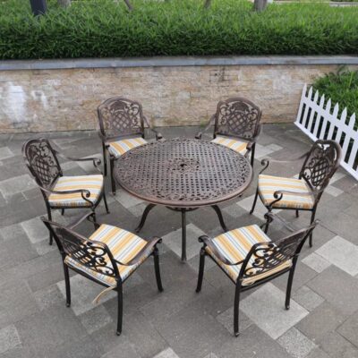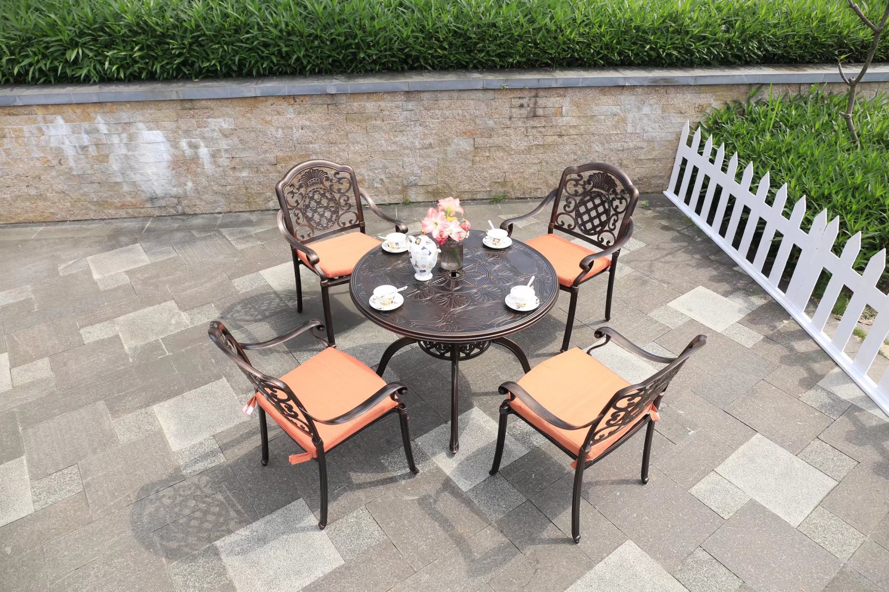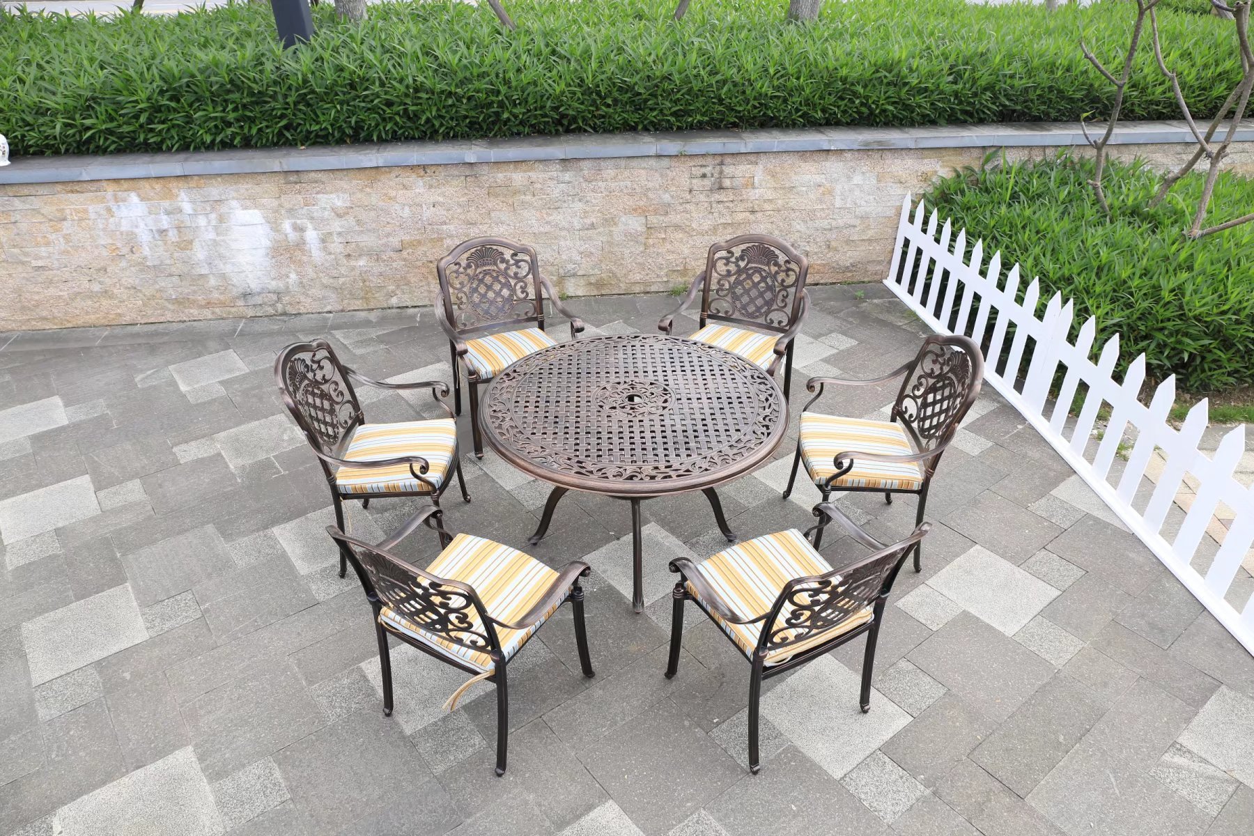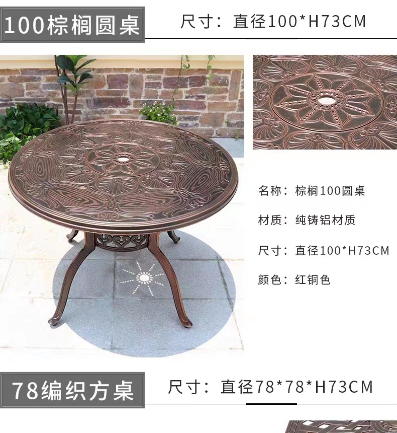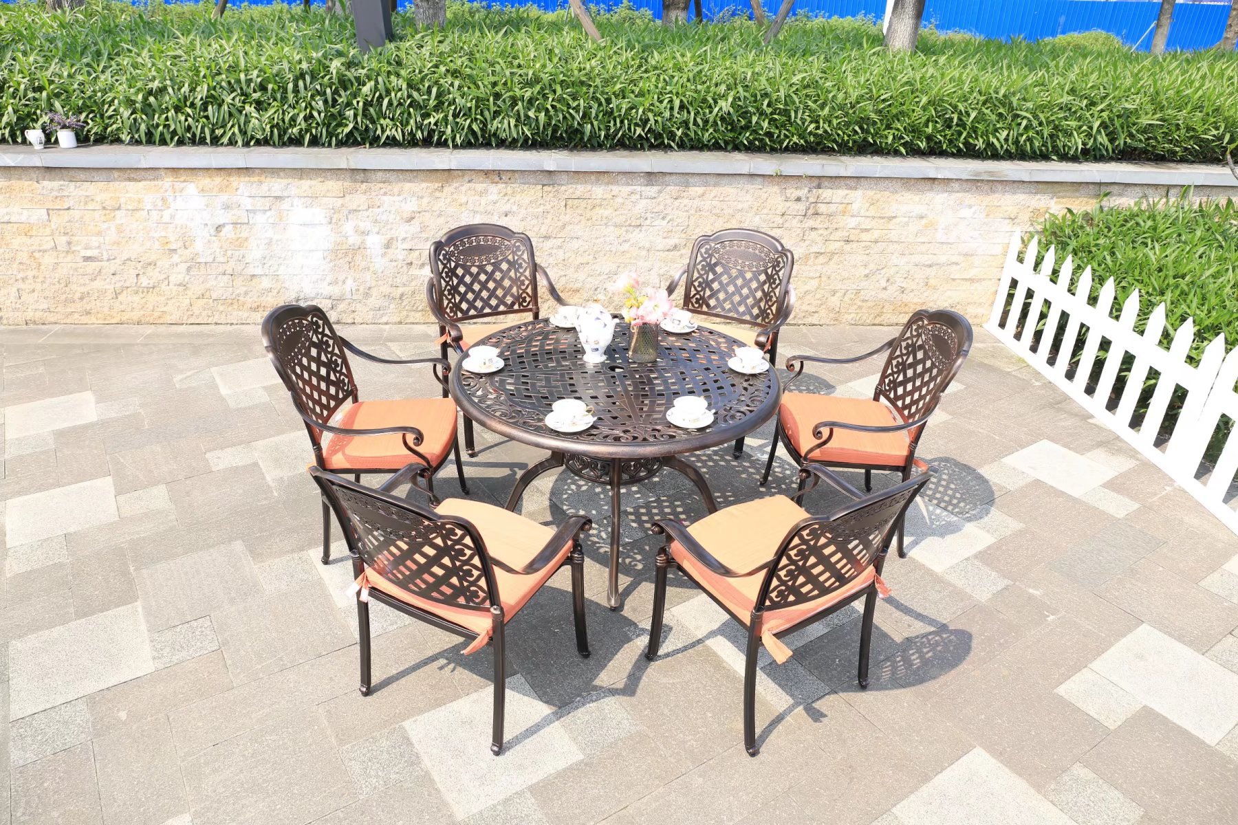 Bộ bàn ghế nhôm đúc ngoài trời nhà ngoài trời sân vườn ngoài trời chống thấm nước chống nắng kết hợp bàn ăn tròn được thiết kế để tạo điểm nhấn cho khu vực sân vườn, ban công hoặc không gian ngoài trời.