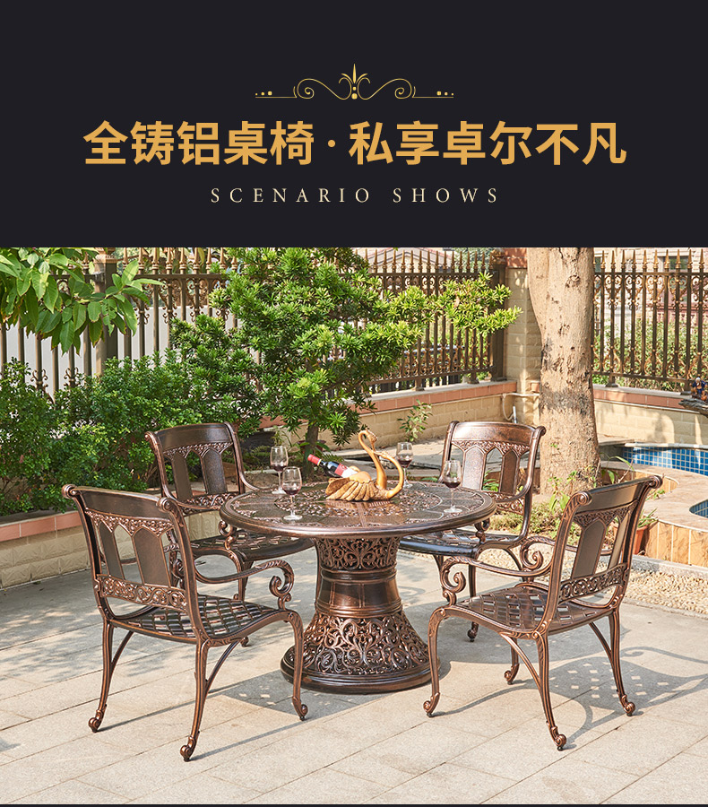 Bộ bàn ghế nhôm đúc phong cách Châu Âu sân vườn ngoài trời biệt thự bàn ghế cao cấp bộ bàn ghế thư giãn ngoài trời bàn ghế là lựa chọn lý tưởng cho không gian công cộng, sân vườn hoặc khu đô thị. Sản phẩm giúp nâng cao hình ảnh chuyên nghiệp và sạch đẹp cho môi trường sống.