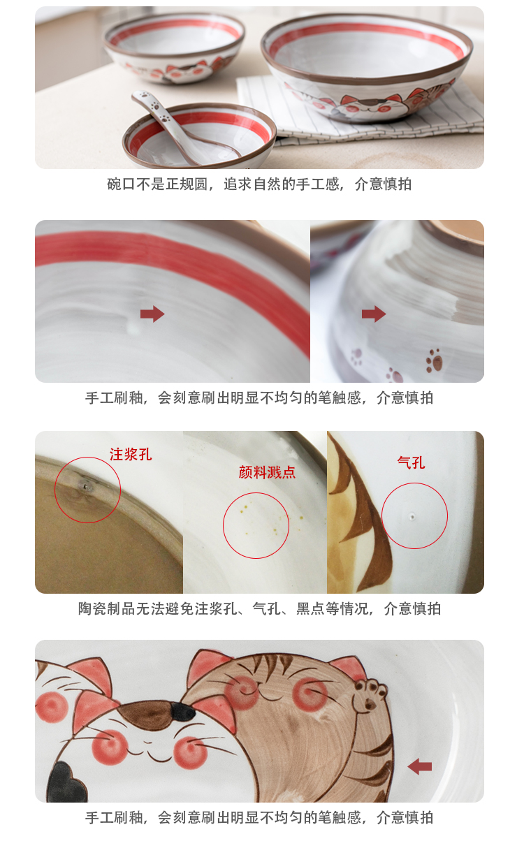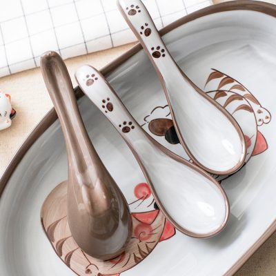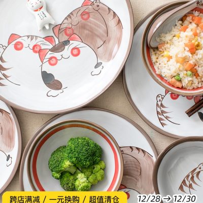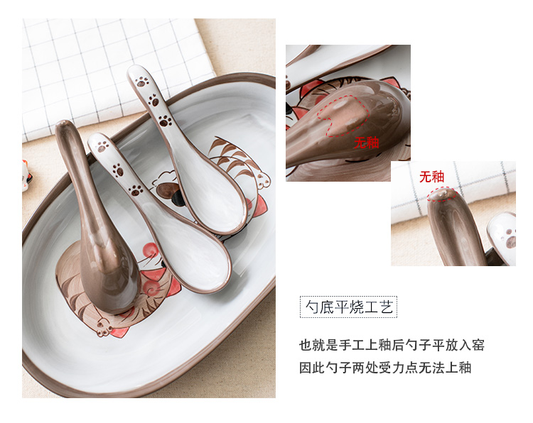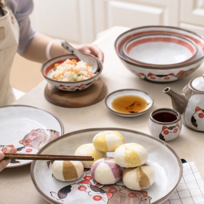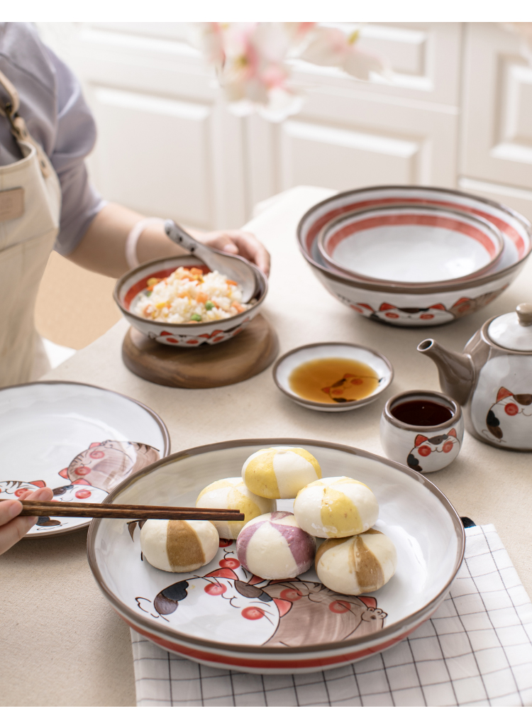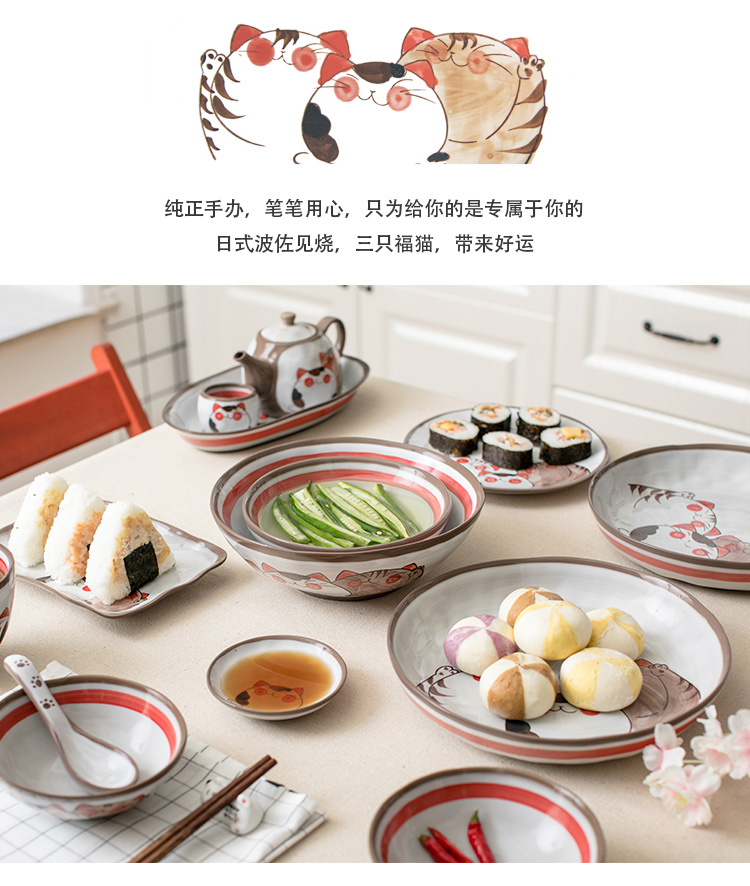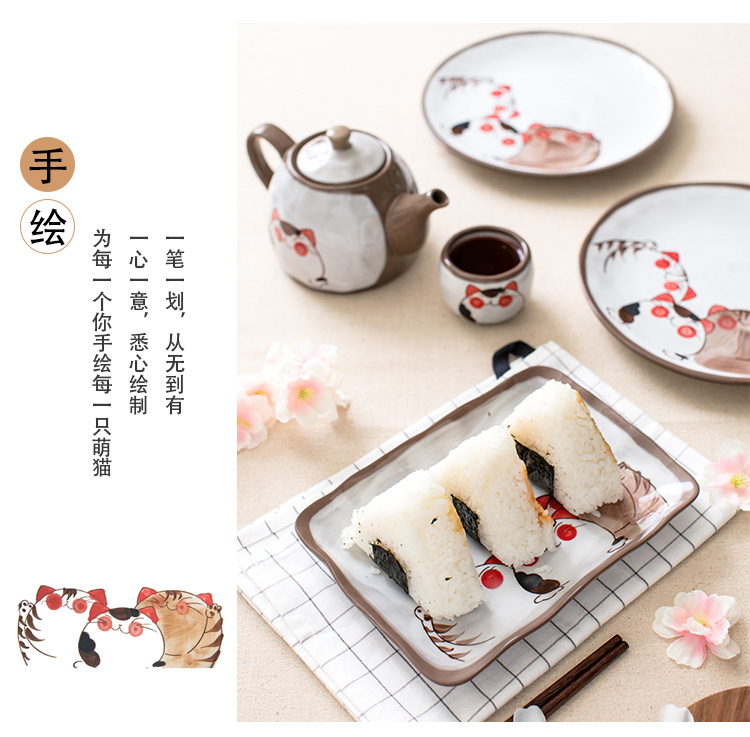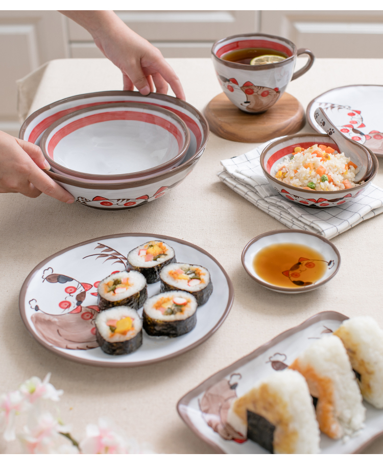 Bộ bát-đĩa ấm-chén muỗng-thìa gốm sứ họa tiết những chú mèo dễ thương, phong cách Nhật Bản.