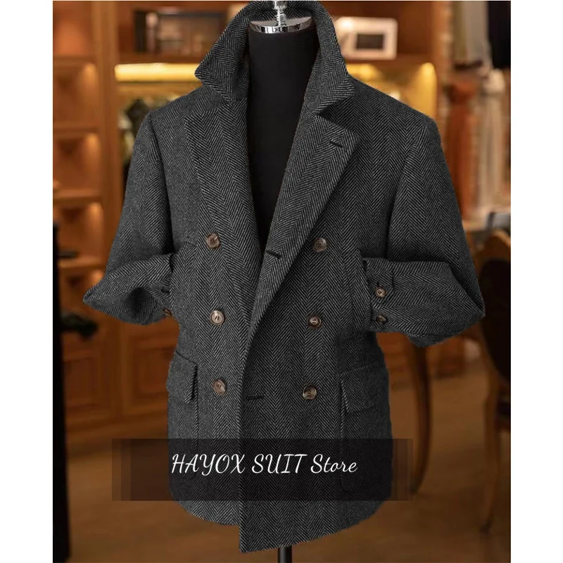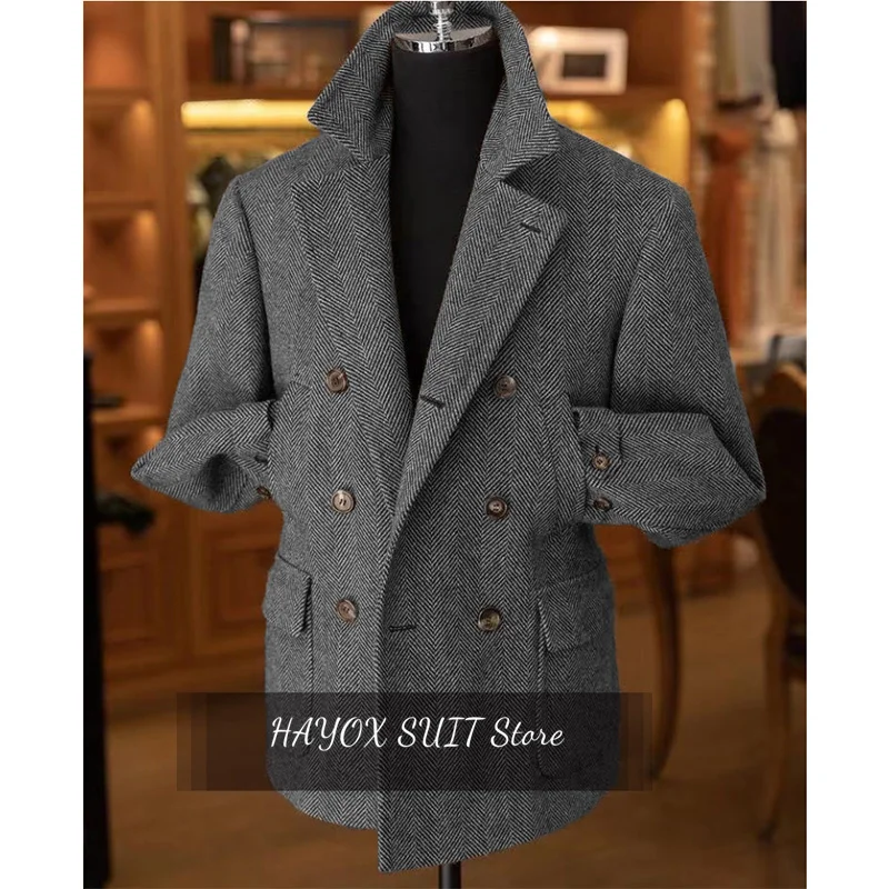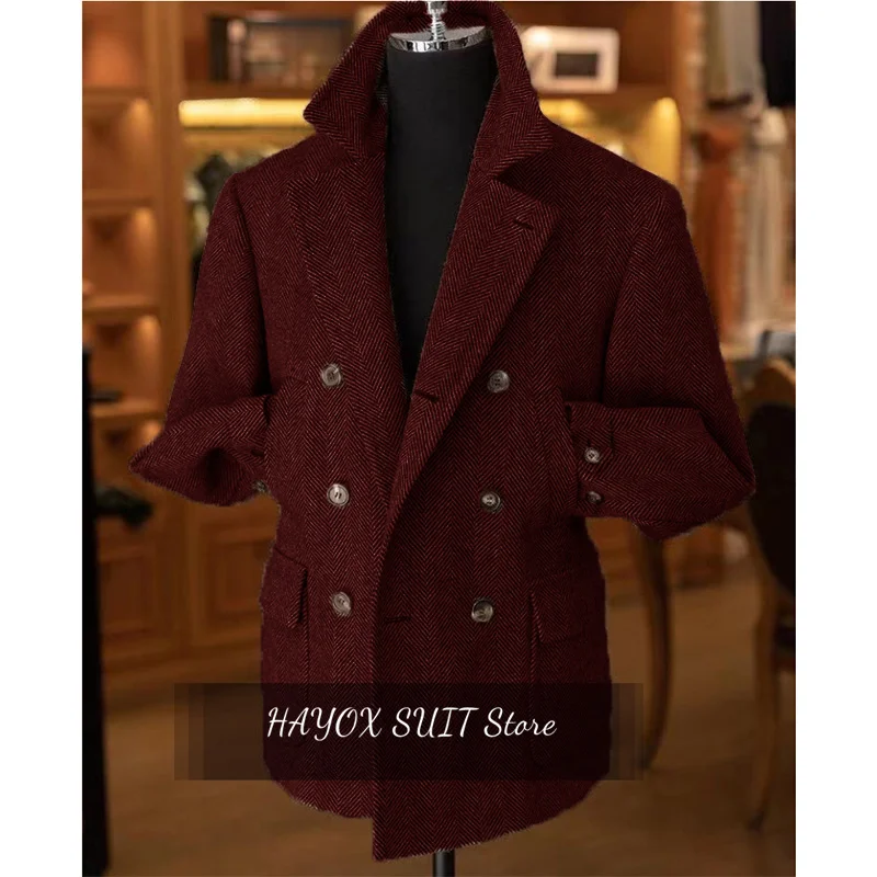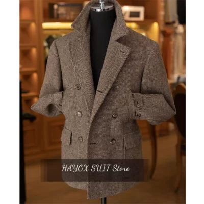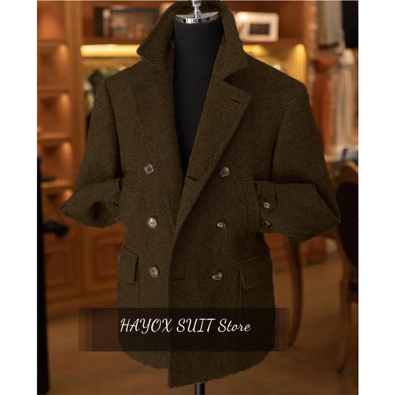 Bộ Đồ Áo Khoác Nam Thắt Lưng Áo Xương Cá Đôi Ngực Vintage Nâu Tweed Nam Thời Trang Phù Hợp Với Áo Khoác Ôm thường Ngày Đi Lại