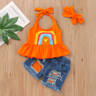 | 外贸新款中小女童套装夏季纯色彩虹印花挂脖吊带破洞牛仔短裤夏装 |