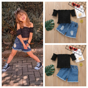 | 2021夏季韩版中小女童一字肩收腰褶皱短袖上衣破洞牛仔短裤套装 |