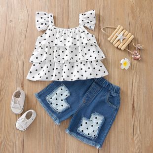 | 儿童夏季童装2021中小女童层叠蛋糕圆点上衣破洞贴布牛仔裤套装 |