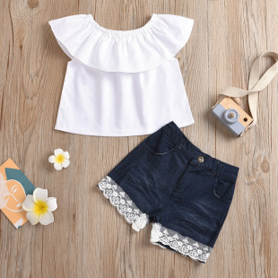 | 夏季女童套装中小童一字肩荷叶领上衣蕾丝花边牛仔短裤童套装 |