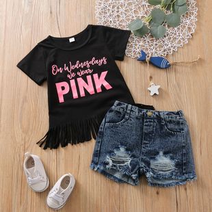 | 夏季女童短袖装黑色圆领不连帽儿童套装字母印花破洞牛仔裤套装 |