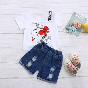 | 一件起批2021新款夏卡通印花斜肩短袖T恤破洞牛仔短裤女夏季套装 |